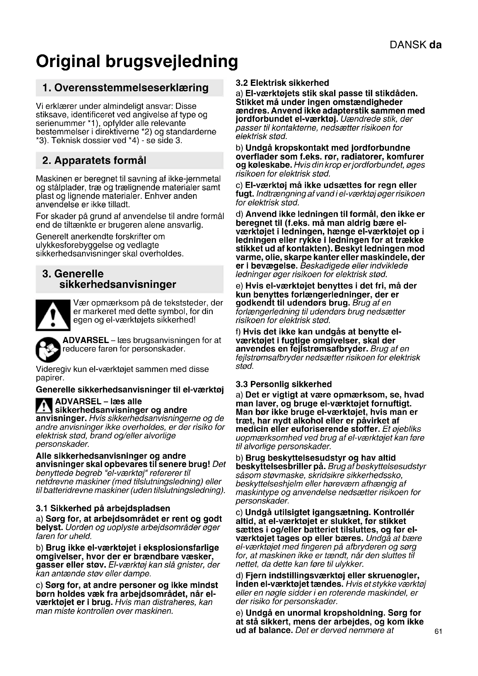 Original brugsvejledning Vi erklærer under almindeligt ansvar: Disse stiksave, identificeret ved angivelse af type og serienummer *1), opfylder alle relevante bestemmelser i direktiverne *2) og standarderne *3). Teknisk dossier ved *4) - se side 3. Maskinen er beregnet til savning af ikke-jernmetal og stålplader, træ og trælignende materialer samt plast og lignende materialer. Enhver anden anvendelse er ikke tilladt. For skader på grund af anvendelse til andre formål end de tiltænkte er brugeren alene ansvarlig. Generelt anerkendte forskrifter om ulykkesforebyggelse og vedlagte sikkerhedsanvisninger skal overholdes. Vær opmærksom på de tekststeder, der er markeret med dette symbol, for din egen og el-værktøjets sikkerhed! ADVARSEL – læs brugsanvisningen for at reducere faren for personskader. Videregiv kun el-værktøjet sammen med disse papirer. Generelle sikkerhedsanvisninger til el-værktøj ADVARSEL – læs alle sikkerhedsanvisninger og andre anvisninger. Hvis sikkerhedsanvisningerne og de andre anvisninger ikke overholdes, er der risiko for elektrisk stød, brand og/eller alvorlige personskader. Alle sikkerhedsanvisninger og andre anvisninger skal opbevares til senere brug! Det benyttede begreb "el-værktøj" refererer til netdrevne maskiner (med tilslutningsledning) eller til batteridrevne maskiner (uden tilslutningsledning).