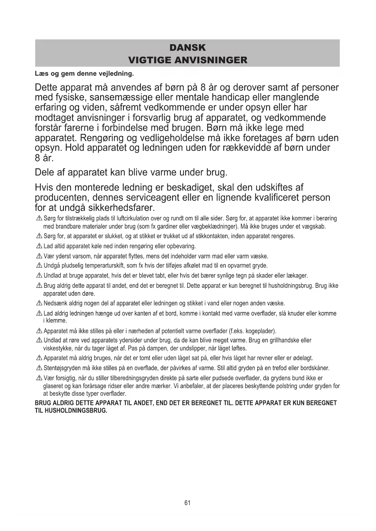 - Stentøjsgryden, der kan tages ud, kan bruges i ovnen. Brug ikke stentøjsgryden, der kan tages ud, på et gasblus, elkomfur eller under grillen.