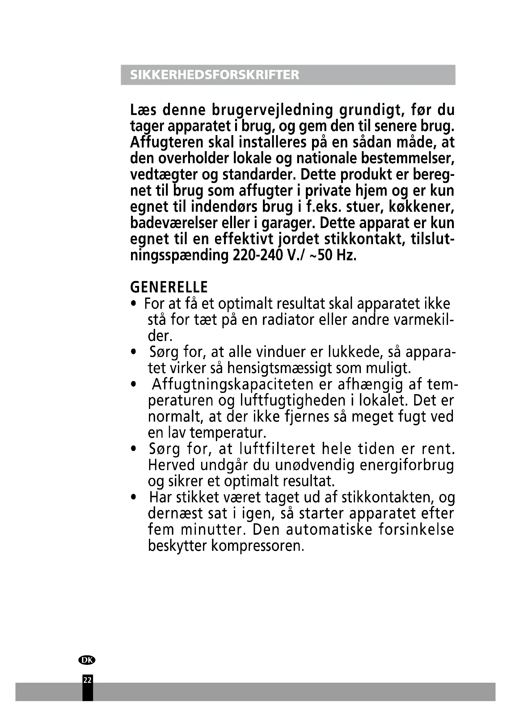 SIKKERHEDSFORSKRIFTER Læs denne brugervejledning grundigt, før du tager apparatet i brug, og gem den til senere brug. Affugteren skal installeres på en sådan måde, at den overholder lokale og nationale bestemmelser, vedtægter og standarder. Dette produkt er bereg- net til brug som affugter i private hjem og er kun egnet til indendørs brug i f.eks. stuer, køkkener, badeværelser eller i garager. Dette apparat er kun egnet til en effektivt jordet stikkontakt, tilslut- ningsspænding 220-240 V./ ~50 Hz. GENERELLE