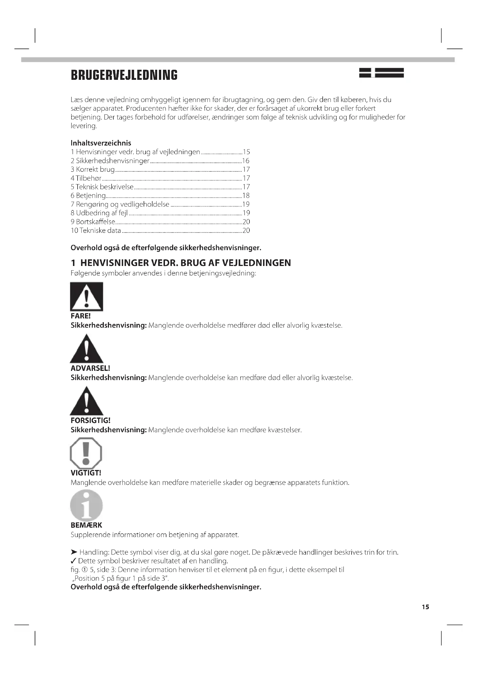 Følgende symboler anvendes i denne betjeningsvejledning: FARE! Sikkerhedshenvisning: Manglende overholdelse medfører død eller alvorlig kvæstelse. ADVARSEL! Sikkerhedshenvisning: Manglende overholdelse kan medføre død eller alvorlig kvæstelse. FORSIGTIG! Sikkerhedshenvisning: Manglende overholdelse kan medføre kvæstelser. VIGTIGT! Manglende overholdelse kan medføre materielle skader og begrænse apparatets funktion. BEMÆRK Supplerende informationer om betjening af apparatet. ➤ Handling: Dette symbol viser dig, at du skal gøre noget. De påkrævede handlinger beskrives trin for trin. ✓ Dette symbol beskriver resultatet af en handling. fig. ➀ 5, side 3: Denne information henviser til et element på en figur, i dette eksempel til „Position 5 på figur 1 på side 3“. Overhold også de efterfølgende sikkerhedshenvisninger.17