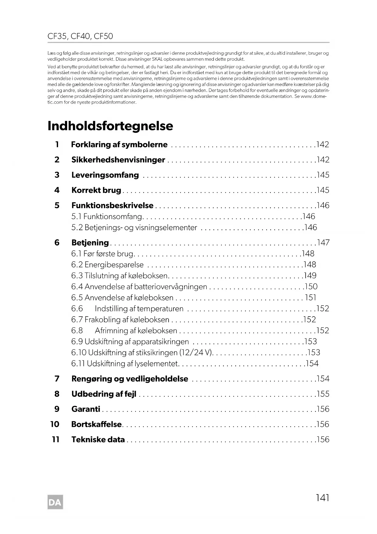 - Læs og følg alle disse anvisninger, retningslinjer og advarsler i denne produktvejledning grundigt for at sikre, at du altid installerer, bruger og vedligeholder produktet korrekt. Disse anvisninger SKAL opbevares sammen med dette produkt. Ved at benytte produktet bekræfter du hermed, at du har læst alle anvisninger, retningslinjer og advarsler grundigt, og at du forstår og er indforstået med de vilkår og betingelser, der er fastlagt heri. Du er indforstået med kun at bruge dette produkt til det beregnede formål og anvendelse i overensstemmelse med anvisningerne, retningslinjerne og advarslerne i denne produktvejledningen samt i overensstemmelse med alle de gældende love og forskrifter. Manglende læsning og ignorering af disse anvisninger og advarsler kan medføre kvæstelser på dig selv og andre, skade på dit produkt eller skade på anden ejendom i nærheden. Der tages forbehold for eventuelle ændringer og opdaterin- ger af denne produktvejledning samt anvisningerne, retningslinjerne og advarslerne samt den tilhørende dokumentation. Se www.dome- tic.com for de nyeste produktinformationer. Indholdsfortegnelse 1 Forklaring af symbolerne p. 142