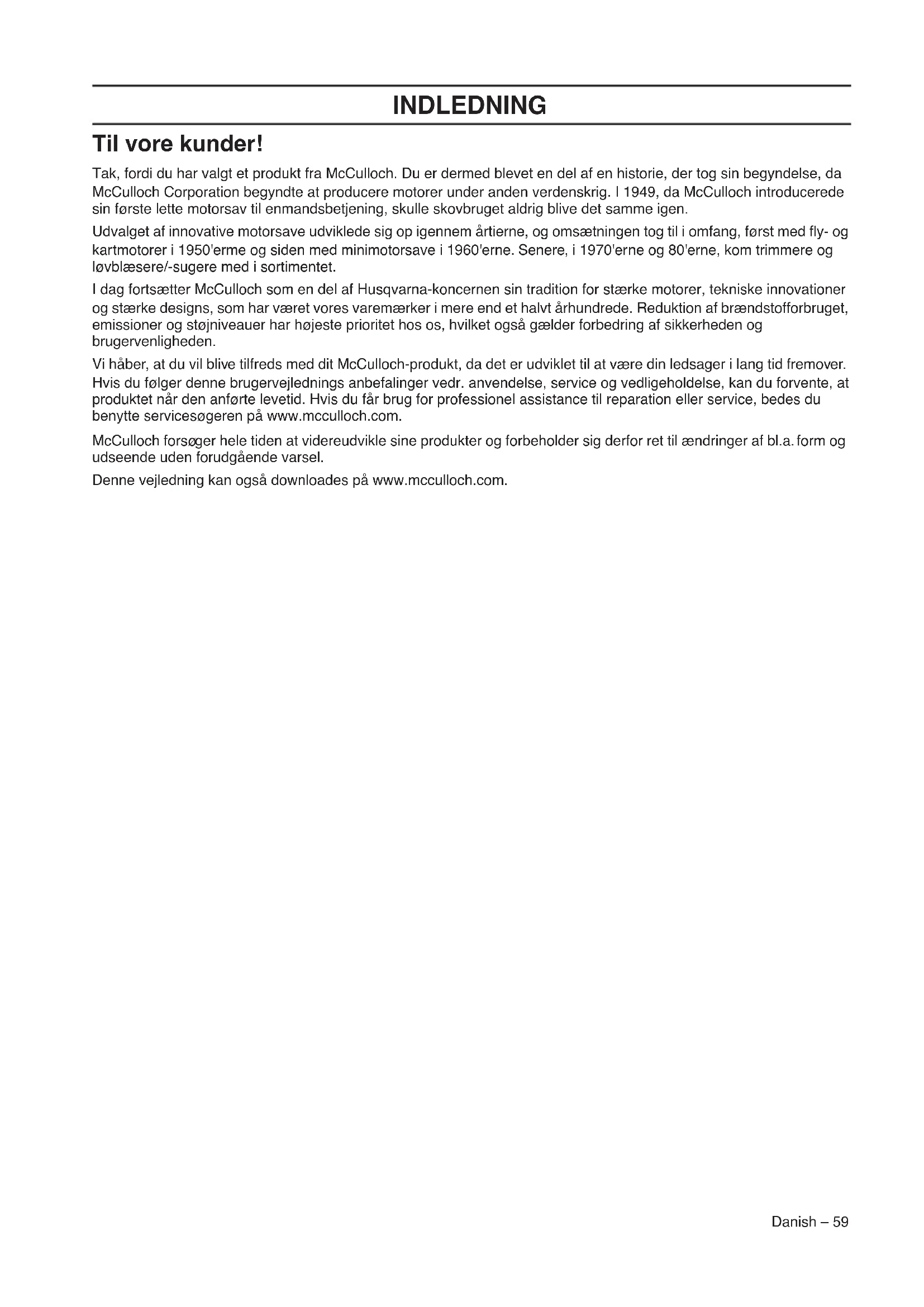 ADVARSEL! En rydningssav, buskrydder eller trimmer kan, hvis den bruges forkert eller skødesløst, være et farligt redskab, som kan forårsage alvorlige skader eller dødsfald for brugeren eller andre. Det er meget vigtigt, at du læser og forstår indholdet i denne brugsanvisning. S1155295-38_1,B40BELITE.r3.fm Page 58 Thursday, September 13, 2018 7:29 AMDanish – 59 INDLEDNING Til vore kunder! Tak, fordi du har valgt et produkt fra McCulloch. Du er dermed blevet en del af en historie, der tog sin begyndelse, da McCulloch Corporation begyndte at producere motorer under anden verdenskrig. I 1949, da McCulloch introducerede sin første lette motorsav til enmandsbetjening, skulle skovbruget aldrig blive det samme igen. Udvalget af innovative motorsave udviklede sig op igennem årtierne, og omsætningen tog til i omfang, først med fly- og kartmotorer i 1950'erme og siden med minimotorsave i 1960'erne. Senere, i 1970'erne og 80'erne, kom trimmere og løvblæsere/-sugere med i sortimentet. I dag fortsætter McCulloch som en del af Husqvarna-koncernen sin tradition for stærke motorer, tekniske innovationer og stærke designs, som har været vores varemærker i mere end et halvt århundrede. Reduktion af brændstofforbruget, emissioner og støjniveauer har højeste prioritet hos os, hvilket også gælder forbedring af sikkerheden og brugervenligheden. Vi håber, at du vil blive tilfreds med dit McCulloch-produkt, da det er udviklet til at være din ledsager i lang tid fremover. Hvis du følger denne brugervejlednings anbefalinger vedr. anvendelse, service og vedligeholdelse, kan du forvente, at produktet når den anførte levetid. Hvis du får brug for professionel assistance til reparation eller service, bedes du benytte servicesøgeren på www.mcculloch.com. McCulloch forsøger hele tiden at videreudvikle sine produkter og forbeholder sig derfor ret til ændringer af bl.a. form og udseende uden forudgående varsel. Denne vejledning kan også downloades på www.mcculloch.com. S1155295-38_1,B40BELITE.r3.fm Page 59 Thursday, September 13, 2018 7:29 AM60 – Danish HVAD ER HVAD? Hvad er hvad på rydningssaven?