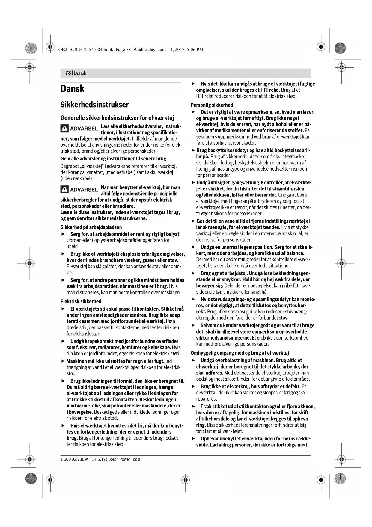 Gebruik bij het vervoeren van het elektrische gereed- schap alleen de transportvoorzieningen en nooit de be- schermingsvoorzieningen. Onderhoud en service Onderhoud en reiniging Trek altijd voor werkzaamheden aan het elektrische gereedschap de stekker uit het stopcontact. Als de aansluitkabel moet worden vervangen, moeten deze werkzaamheden door Bosch of een erkende klantenservice voor Bosch elektrische gereedschappen worden uitgevoerd om veiligheidsrisico’s te voorkomen. Reiniging Houd het elektrische gereedschap en de ventilatieopeningen altijd schoon om goed en veilig te werken. De pendelbeschermkap moet altijd vrij kunnen bewegen en zelfstandig kunnen sluiten. Houd daarom de omgeving rond de pendelbeschermkap altijd schoon. Verwijder na de werkzaamheden stof en spanen door uitbla- zen met perslucht of met een kwast. Reinig de glijrol 20 regelmatig. Toebehoren Klantenservice en gebruiksadviezen Onze klantenservice beantwoordt uw vragen over reparatie en onderhoud van uw product en over vervangingsonderde- len. Explosietekeningen en informatie over vervangingson- derdelen vindt u ook op: www.bosch-pt.com Het Bosch-team voor gebruiksadviezen helpt u graag bij vra- gen over onze producten en toebehoren. Vermeld bij vragen en bestellingen van vervangingsonderde- len altijd het uit tien cijfers bestaande productnummer vol- gens het typeplaatje van het product. Nederland Tel.: (076) 579 54 54 Fax: (076) 579 54 94 E-mail: gereedschappen@nl.bosch.com België Tel.: (02) 588 0589 Fax: (02) 588 0595 E-mail: outillage.gereedschap@be.bosch.com Afvalverwijdering Elektrische gereedschappen, toebehoren en verpakkingen moeten op een voor het milieu verantwoorde wijze worden hergebruikt. Gooi elektrische gereedschappen niet bij het huis- vuil! Alleen voor landen van de EU: Volgens de Europese richtlijn 2012/19/EU over elektrische en elektronische oude apparaten en de omzetting van de richtlijn in nationaal recht moeten niet meer bruikbare elektri- sche gereedschappen apart worden ingezameld en op een voor het milieu verantwoorde wijze worden hergebruikt. Wijzigingen voorbehouden. Product- nummer Lijmklem 1 609 B04 224 Inlegplaten 1 609 B05 242 Stofzak 1 609 B05 010 Zaagbladen voor hout- en plaatmateriaal, panelen en lijsten Zaagblad 216 x 30 mm, 48 tanden 2 608 640 641 Zaagbladen voor kunststof en non-ferrometalen Zaagblad 216 x 30 mm, 80 tanden 2 608 640 447 Zaagbladen voor alle soorten laminaatvloeren Zaagblad 216 x 30 mm, 60 tanden 2 608 642 133 OBJ_BUCH-2154-004.book Page 77 Wednesday, June 14, 2017 5:06 PM78 | Dansk 1 609 92A 3BW | (14.6.17) Bosch Power Tools Dansk Sikkerhedsinstrukser Generelle sikkerhedsinstrukser for el-værktøj Læs alle sikkerhedsadvarsler, instruk- tioner, illustrationer og specifikatio- ner, som følger med el-værktøjet. I tilfælde af manglende overholdelse af anvisningerne nedenfor er der risiko for elek- trisk stød, brand og/eller alvorlige personskader. Gem alle advarsler og instruktioner til senere brug. Begrebet „el-værktøj“ i advarslerne refererer til el-værktøj, der kører på lysnettet, (med netkabel) samt akku-værktøj (uden netkabel). Når man benytter el-værktøj, bør man altid følge nedenstående principielle sikkerhedsregler for at undgå, at der opstår elektrisk stød, personskader eller brandfare. Læs alle disse instrukser, inden el-værktøjet tages i brug, og gem derefter sikkerhedsinstrukserne. Sikkerhed på arbejdspladsen Sørg for, at arbejdsområdet er rent og rigtigt belyst. Uorden eller uoplyste arbejdsområder øger faren for uheld. Brug ikke el-værktøjet i eksplosionsfarlige omgivelser, hvor der findes brændbare væsker, gasser eller støv. El-værktøj kan slå gnister, der kan antænde støv eller dam- pe. Sørg for, at andre personer og ikke mindst børn holdes væk fra arbejdsområdet, når maskinen er i brug. Hvis man distraheres, kan man miste kontrollen over maskinen. Elektrisk sikkerhed El-værktøjets stik skal passe til kontakten. Stikket må under ingen omstændigheder ændres. Brug ikke adap- terstik sammen med jordforbundet el-værktøj. Uæn- drede stik, der passer til kontakterne, nedsætter risikoen for elektrisk stød. Undgå kropskontakt med jordforbundne overflader som f.eks. rør, radiatorer, komfurer og køleskabe. Hvis din krop er jordforbundet, øges risikoen for elektrisk stød. Maskinen må ikke udsættes for regn eller fugt. Ind- trængning af vand i et el-værktøj øger risikoen for elektrisk stød. Brug ikke ledningen til formål, den ikke er beregnet til. Du må aldrig bære el-værktøjet i ledningen, hænge el-værktøjet op i ledningen eller rykke i ledningen for at trække stikket ud af kontakten. Beskyt ledningen mod varme, olie, skarpe kanter eller maskindele, der er i bevægelse. Beskadigede eller indviklede ledninger øger risikoen for elektrisk stød. Hvis el-værktøjet benyttes i det fri, må der kun benyt- tes en forlængerledning, der er egnet til udendørs brug. Brug af forlængerledning til udendørs brug nedsæt- ter risikoen for elektrisk stød. Hvis det ikke kan undgås at bruge el-værktøjet i fugtige omgivelser, skal der bruges et HFI-relæ. Brug af et HFI-relæ reducerer risikoen for at få elektrisk stød. Personlig sikkerhed Det er vigtigt at være opmærksom, se, hvad man laver, og bruge el-værktøjet fornuftigt. Brug ikke noget el-værktøj, hvis du er træt, har nydt alkohol eller er på- virket af medikamenter eller euforiserende stoffer. Få sekunders uopmærksomhed ved brug af el-værktøjet kan føre til alvorlige personskader. Brug beskyttelsesudstyr og hav altid beskyttelsesbril- ler på. Brug af sikkerhedsudstyr som f.eks. støvmaske, skridsikkert fodtøj, beskyttelseshjelm eller høreværn af- hængig af maskintype og anvendelse nedsætter risikoen for personskader. Undgå utilsigtet igangsætning. Kontrollér, at el-værktø- jet er slukket, før du tilslutter det til strømtilførslen og/eller akkuen, løfter eller bærer det. Undgå at bære el-værktøjet m