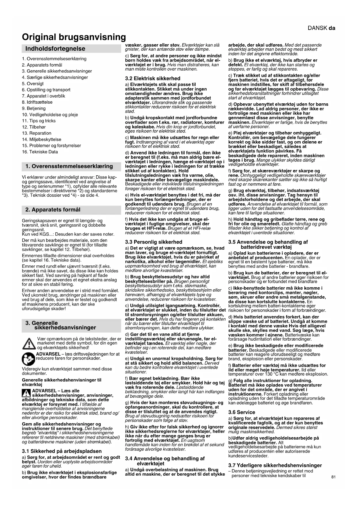 Vi erklærer under almindeligt ansvar: Disse kap- og geringssave, identificeret ved angivelse af type og serienummer *1), opfylder alle relevante bestemmelser i direktiverne *2) og standarderne *3). Teknisk dossier ved *4) - se side 4. Geringskapsaven er egnet til længde- og tværsnit, skrå snit, geringssnit og dobbelte geringssnit. Kun ved KGS...: Desuden kan der saves noter. Der må kun bearbejdes materiale, som den tilsvarende savklinge er egnet til (for tilladte savklinger, se kapitel 12. Tilbehør). Emnernes tilladte dimensioner skal overholdes (se kapitel 16. Tekniske data). Emner med rundt eller ujævnt tværsnit (f.eks. brænde) må ikke savet, da disse ikke kan holdes sikkert fast. Ved savning på højkant af flade emner skal der anvendes et egnet ekstra anslag for at sikre en stabil føring. Enhver anden anvendelse er i strid med formålet. Ved ukorrekt brug, ændringer på maskinen eller ved brug af dele, som ikke er testet og godkendt af maskinens producent, kan der ske uforudsigelige skader! Vær opmærksom på de tekststeder, der er markeret med dette symbol, for din egen og elværktøjets sikkerhed! ADVARSEL – læs driftsvejledningen for at reducere faren for personskader. Videregiv kun elværktøjet sammen med disse dokumenter. Generelle sikkerhedshenvisninger til elværktøj ADVARSEL – Læs alle sikkerhedshenvisninger, anvisninger, afbildninger og tekniske data, som dette elværktøj er forsynet med. I tilfælde af manglende overholdelse af anvisningerne nedenfor er der risiko for elektrisk stød, brand og/ eller alvorlige personskader. Gem alle sikkerhedshenvisninger og instruktioner til senere brug. Det benyttede begreb "elværktøj" i sikkerhedshenvisningerne refererer til netdrevne maskiner (med strømkabel) og batteridrevne maskiner (uden strømkabel).