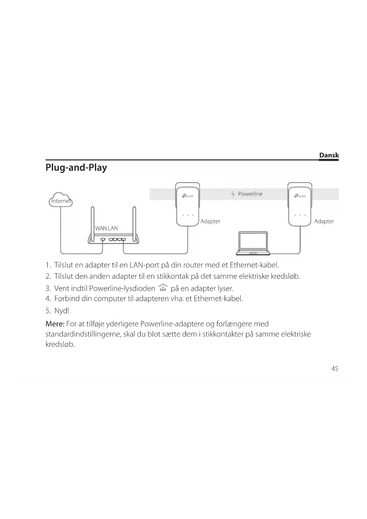 Mere: For at tilføje yderligere Powerline-adaptere og forlængere med standardindstillingerne, skal du blot sætte dem i stikkontakter på samme elektriske kredsløb. Internet WAN LAN Adapter Adapter PowerlineDansk