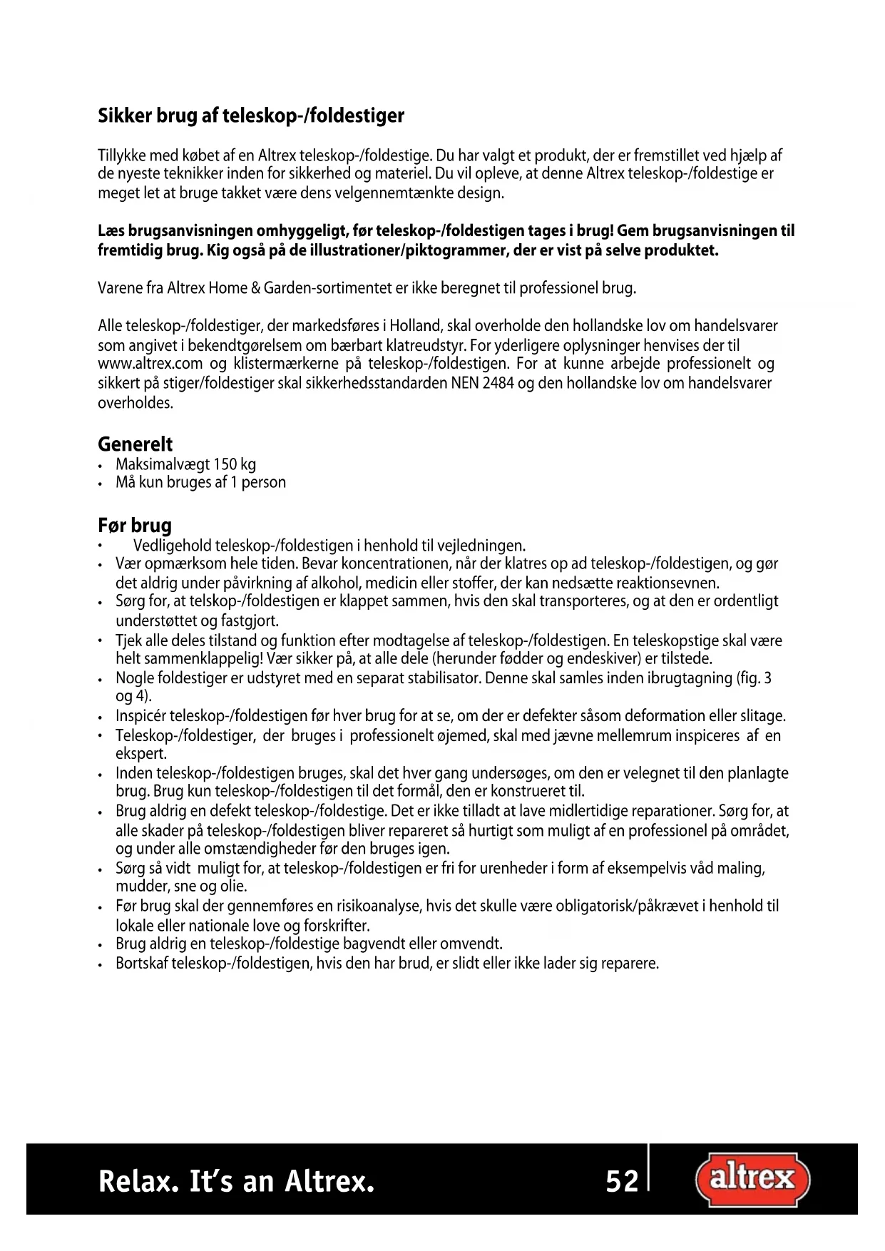 d.52 53 Relax. It’s an Altrex. Sikker brug af teleskop-/foldestiger Tillykke med købet af en Altrex teleskop-/foldestige. Du har valgt et produkt, der er fremstillet ved hjælp af de nyeste teknikker inden for sikkerhed og materiel. Du vil opleve, at denne Altrex teleskop-/foldestige er meget let at bruge takket være dens velgennemtænkte design. Læs brugsanvisningen omhyggeligt, før teleskop-/foldestigen tages i brug! Gem brugsanvisningen til fremtidig brug. Kig også på de illustrationer/piktogrammer, der er vist på selve produktet. Varene fra Altrex Home & Garden-sortimentet er ikke beregnet til professionel brug. Alle teleskop-/foldestiger, der markedsføres i Holland, skal overholde den hollandske lov om handelsvarer som angivet i bekendtgørelsem om bærbart klatreudstyr. For yderligere oplysninger henvises der til www.altrex.com og klistermærkerne på teleskop-/foldestigen. For at kunne arbejde professionelt og sikkert på stiger/foldestiger skal sikkerhedsstandarden NEN 2484 og den hollandske lov om handelsvarer overholdes. Generelt Maksimalvægt 150 kg Må kun bruges af 1 person Før brug Vedligehold teleskop-/foldestigen i henhold til vejledningen. Vær opmærksom hele tiden. Bevar koncentrationen, når der klatres op ad teleskop-/foldestigen, og gør det aldrig under påvirkning af alkohol, medicin eller stoffer, der kan nedsætte reaktionsevnen. Sørg for, at telskop-/foldestigen er klappet sammen, hvis den skal transporteres, og at den er ordentligt understøttet og fastgjort. Tjek alle deles tilstand og funktion efter modtagelse af teleskop-/foldestigen. En teleskopstige skal være helt sammenklappelig! Vær sikker på, at alle dele (herunder fødder og endeskiver) er tilstede. Nogle foldestiger er udstyret med en separat stabilisator. Denne skal samles inden ibrugtagning (fig. 3 og 4). Inspicér teleskop-/foldestigen før hver brug for at se, om der er defekter såsom deformation eller slitage. Teleskop-/foldestiger, der bruges i professionelt øjemed, skal med jævne mellemrum inspiceres af en ekspert. Inden teleskop-/foldestigen bruges, skal det hver gang undersøges, om den er velegnet til den planlagte brug. Brug kun teleskop-/foldestigen til det formål, den er konstrueret til. Brug aldrig en defekt teleskop-/foldestige. Det er ikke tilladt at lave midlertidige reparationer. Sørg for, at alle skader på teleskop-/foldestigen bliver repareret så hurtigt som muligt af en professionel på området, og under alle omstændigheder før den bruges igen. Sørg så vidt muligt for, at teleskop-/foldestigen er fri for urenheder i form af eksempelvis våd maling, mudder, sne og olie. Før brug skal der gennemføres en risikoanalyse, hvis det skulle være obligatorisk/påkrævet i henhold til lokale eller nationale love og forskrifter. Brug aldrig en teleskop-/foldestige bagvendt eller omvendt. Bortskaf teleskop-/foldestigen, hvis den har brud, er slidt eller ikke lader sig reparere.