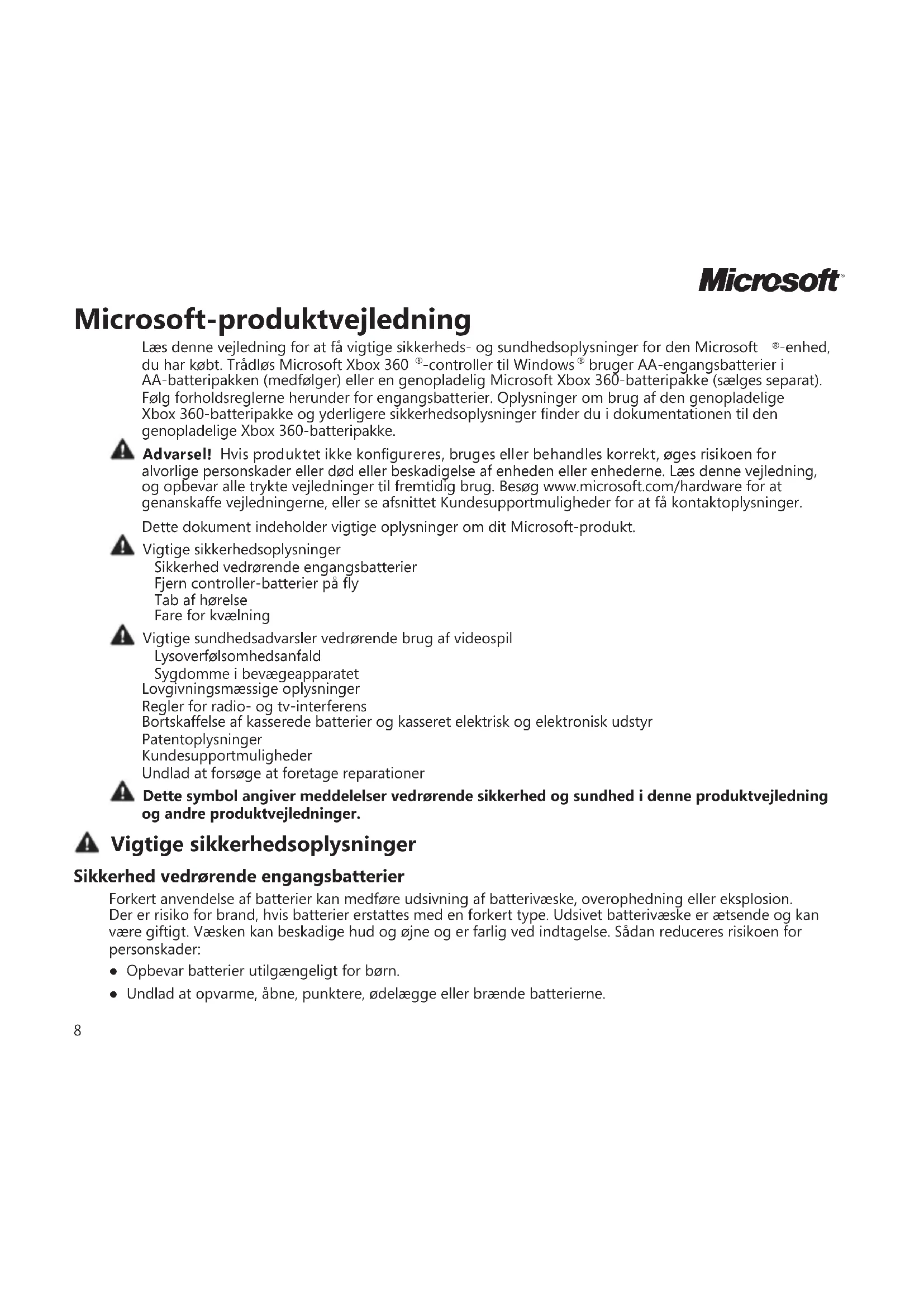 bruger AA-engangsbatterier i AA-batteripakken (medfølger) eller en genopladelig Microsoft Xbox 360-batteripakke (sælges separat). Følg forholdsreglerne herunder for engangsbatterier. Oplysninger om brug af den genopladelige Xbox 360-batteripakke og yderligere sikkerhedsoplysninger nder du i dokumentationen til den genopladelige Xbox 360-batteripakke. Advarsel! Hvis produktet ikke kongureres, bruges eller behandles korrekt, øges risikoen for alvorlige personskader eller død eller beskadigelse af enheden eller enhederne. Læs denne vejledning, og opbevar alle trykte vejledninger til fremtidig brug. Besøg www.microsoft.com/hardware for at genanskaffe vejledningerne, eller se afsnittet Kundesupportmuligheder for at få kontaktoplysninger. Dette dokument indeholder vigtige oplysninger om dit Microsoft-produkt. Vigtige sikkerhedsoplysninger Sikkerhed vedrørende engangsbatterier Fjern controller-batterier på y Tab af hørelse Fare for kvælning Vigtige sundhedsadvarsler vedrørende brug af videospil Lysoverfølsomhedsanfald Sygdomme i bevægeapparatet Lovgivningsmæssige oplysninger Regler for radio- og tv-interferens Bortskaffelse af kasserede batterier og kasseret elektrisk og elektronisk udstyr Patentoplysninger Kundesupportmuligheder Undlad at forsøge at foretage reparationer Dette symbol angiver meddelelser vedrørende sikkerhed og sundhed i denne produktvejledning og andre produktvejledninger. Vigtige sikkerhedsoplysninger Sikkerhed vedrørende engangsbatterier Forkert anvendelse af batterier kan medføre udsivning af batterivæske, overophedning eller eksplosion. Der er risiko for brand, hvis batterier erstattes med en forkert type. Udsivet batterivæske er ætsende og kan være giftigt. Væsken kan beskadige hud og øjne og er farlig ved indtagelse. Sådan reduceres risikoen for personskader: ● Opbevar batterier utilgængeligt for børn. ● Undlad at opvarme, åbne, punktere, ødelægge eller brænde batterierne.