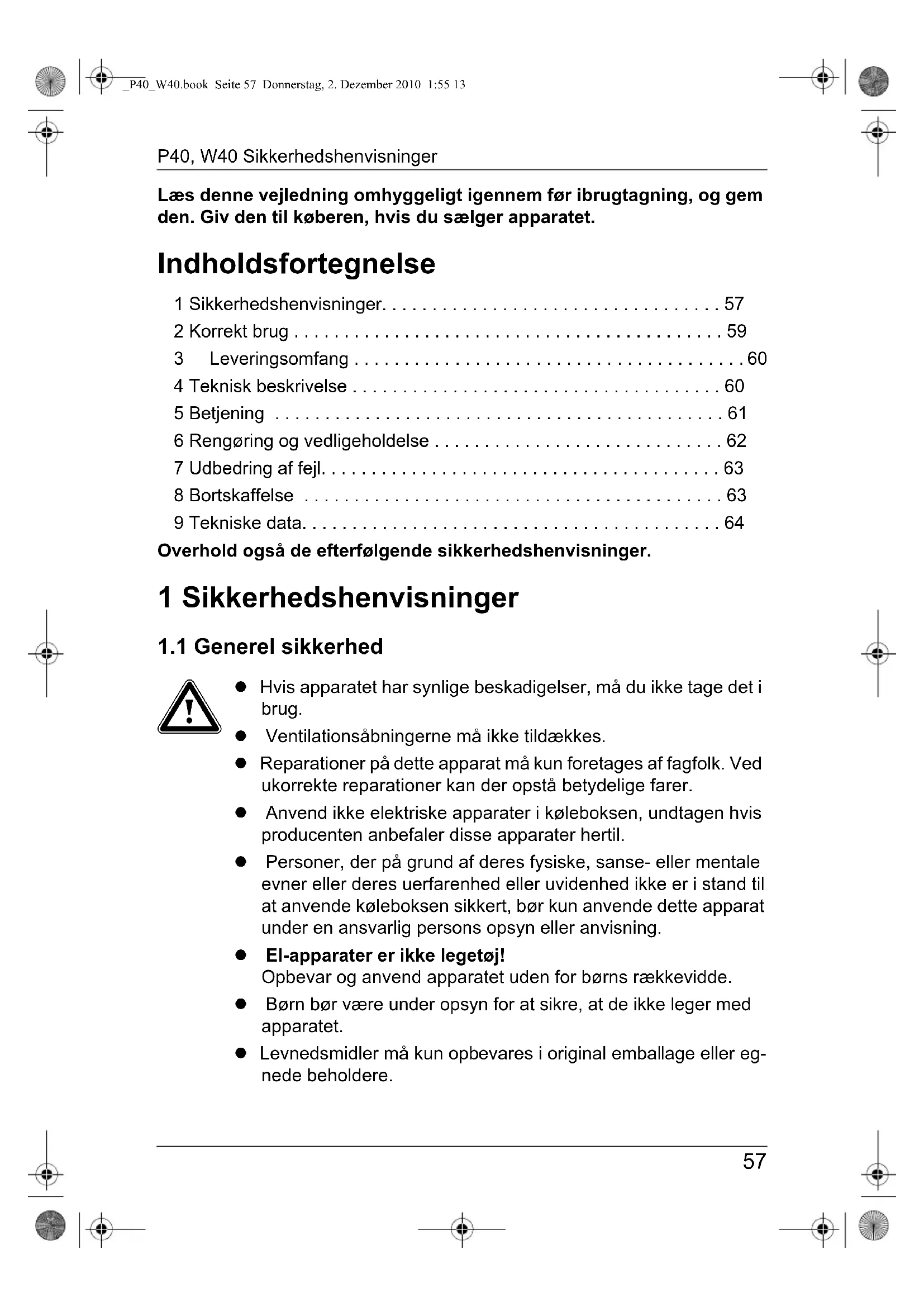 - Læs denne vejledning omhyggeligt igennem før ibrugtagning, og gem den. Giv den til køberen, hvis du sælger apparatet. Indholdsfortegnelse 1 Sikkerhedshenvisninger p. 57