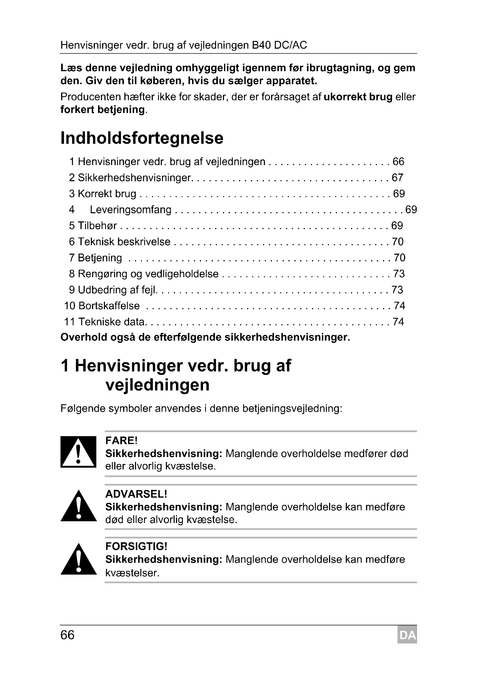 FORSIGTIG! Sikkerhedshenvisning: Manglende overholdelse kan medføre kvæstelser. _B40.book Seite 66 Mittwoch, 20. April 2011 3:28 15DA B40 DC/AC Sikkerhedshenvisninger