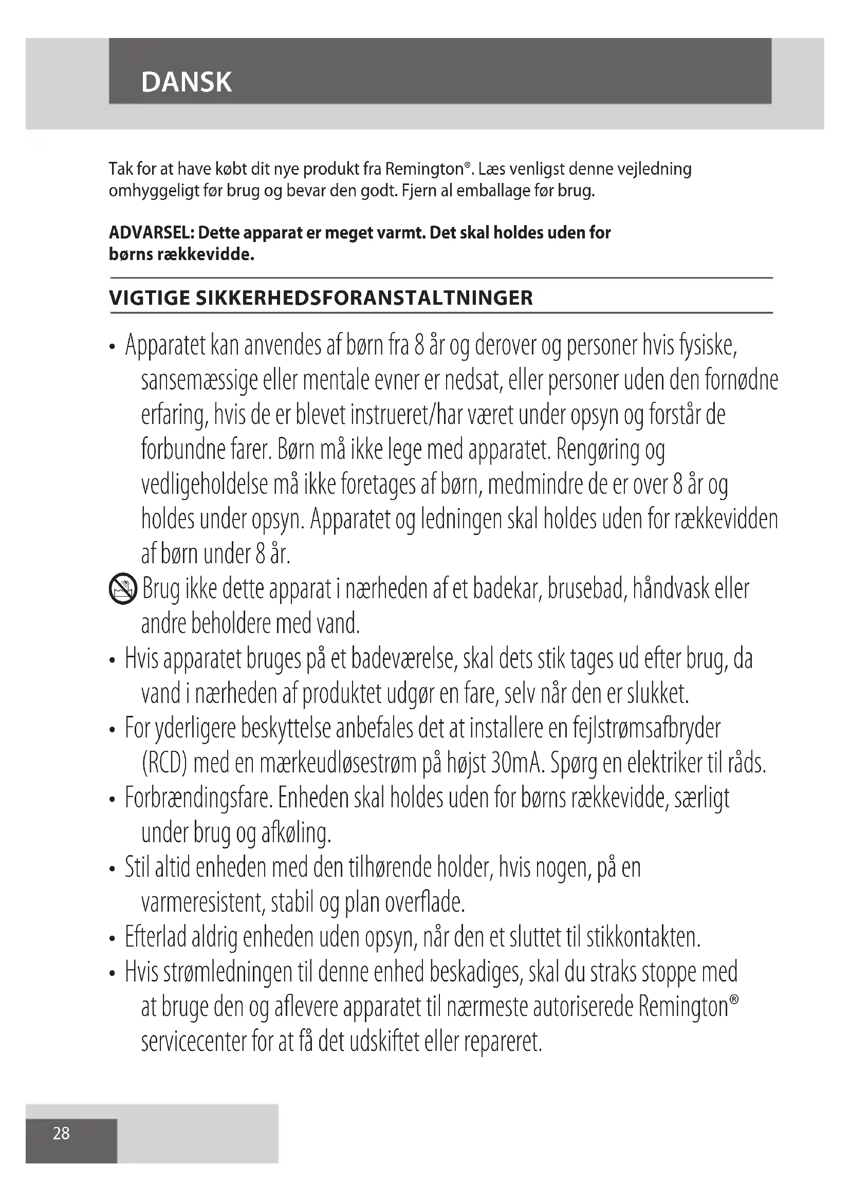 Hvis strømledningen til denne enhed beskadiges, skal du straks stoppe med at bruge den og aflevere apparatet til nærmeste autoriserede Remington® servicecenter for at få det udskiftet eller repareret.