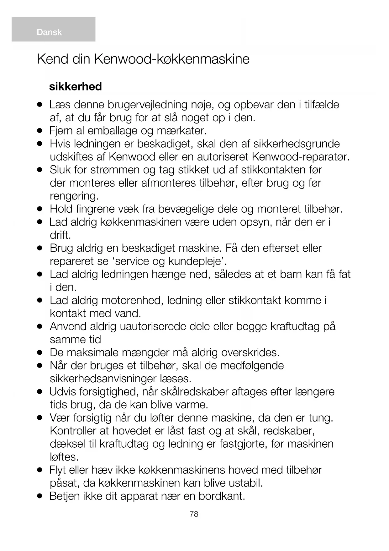 Betjen ikke dit apparat nær en bordkant. Dansk Kend din Kenwood-køkkenmaskine78 79