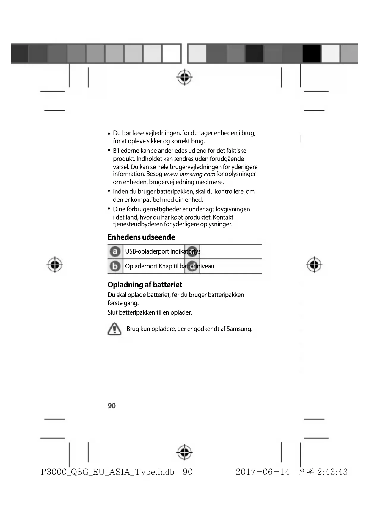 Dine forbrugerrettigheder er underlagt lovgivningen i det land, hvor du har købt produktet. Kontakt tjenesteudbyderen for yderligere oplysninger. Enhedens udseende USB-opladerport Indikatorlys Opladerport Knap til batteriniveau Opladning af batteriet Du skal oplade batteriet, før du bruger batteripakken første gang. Slut batteripakken til en oplader. Brug kun opladere, der er godkendt af Samsung. Dansk P3000_QSG_EU_ASIA_Type.indb 90P3000_QSG_EU_ASIA_Type.indb 90 2017-06-14 오후 2:43:432017-06-14 오후 2:43:4391 Dansk