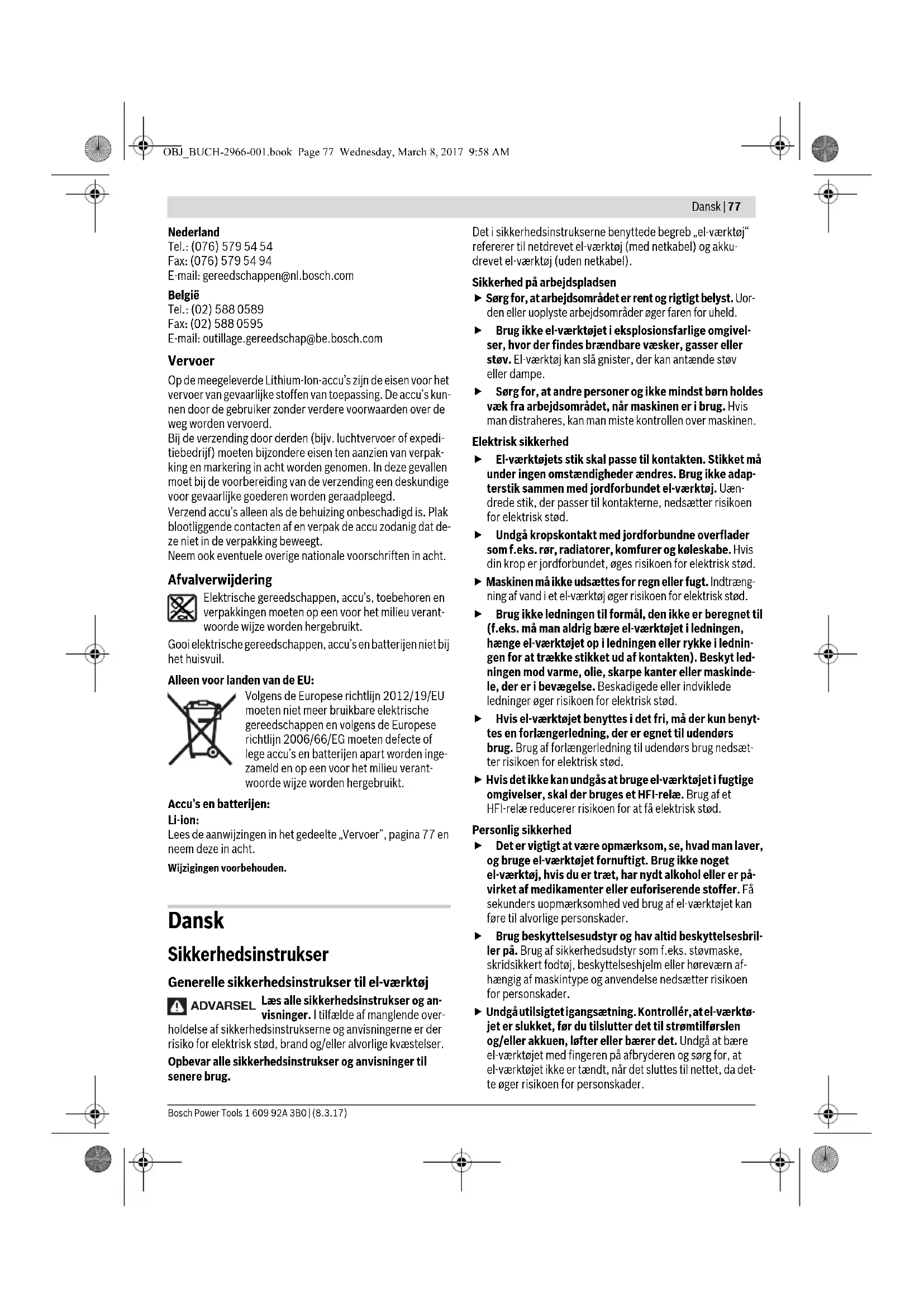 Schuurblad Materiaal Gebruik Korrel OBJ_BUCH-2966-001.book Page 75 Wednesday, March 8, 2017 9:58 AM76 | Nederlands 1 609 92A 3B0 | (8.3.17) Bosch Power Tools Opmerking: Houd de ventilatieopeningen 7 van het elektri- sche gereedschap tijdens de werkzaamheden niet dicht, om- dat anders de levensduur van het elektrische gereedschap verkort wordt. Let er tijdens werkzaamheden met HCS-inzetgereedschap- pen op dat de bekleding van de gereedschappen onbescha- digd is. Werkprincipe Door de oscillerende aandrijving trilt het inzetgereedschap tot 20000 keer per minuut 2,8° heen en weer. Daardoor zijn nauwkeurige werkzaamheden binnen een zeer kleine ruimte mogelijk. Werk met geringe en gelijkmatige aandruk- kracht. Anders verslechtert het arbeidsver- mogen en kan het inzetgereedschap blok- keren. Beweeg tijdens de werkzaamheden het elektrische gereedschap heen en weer, zodat het inzetgereedschap niet te warm wordt en niet blokkeert. Zagen Gebruik alleen onbeschadigde zaagbladen die hele- maal in orde zijn. Verbogen of niet-scherpe zaagbladen kunnen breken, het zagen negatief beïnvloeden of een te- rugslag veroorzaken. Neem bij het zagen van lichte bouwmaterialen de wet- telijke voorschriften en de adviezen van de fabrikanten van de materialen in acht. Alleen zachte materialen als hout en gipskarton mogen invallend worden gezaagd. Controleer hout, spaanplaat, bouwmaterialen enz., voordat u met HCS-zaagbladen in deze materialen zaagt, op spijkers, schroeven en dergelijke, en verwijder deze voorwerpen in- dien nodig, of gebruik bimetaalzaagbladen. Afkorten Opmerking: Let er bij het afkorten van wandtegels op dat de inzetgereedschappen bij langdurig gebruik aan grote slijtage onderhevig zijn. Schuren De afnamecapaciteit en het schuurbeeld worden in hoofd- zaak bepaald door de keuze van het schuurblad, het vooraf in- gestelde aantal schuurbewegingen en de aandrukkracht. Alleen onbeschadigde schuurbladen zorgen voor een goede schuurcapaciteit en ontzien het elektrische gereedschap. Let op een gelijkmatige aandrukkracht om de levensduur van de schuurbladen te verlengen. Een overmatige verhoging van de aandrukkracht leidt niet tot een groter schuurvermogen, maar wel tot een sterkere slijta- ge van het elektrische gereedschap en het schuurblad. Voor zeer nauwkeurig schuren van hoeken, randen en moeilijk bereikbare gebieden kunt u ook alleen met de punt of een rand van het schuurplateau werken. Bij het schuren op een klein oppervlak kan het schuurblad zeer warm worden. Verminder het aantal schuurbewegingen en de aandrukkracht en laat het schuurblad regelmatig afkoelen. Gebruik een schuurblad waarmee metaal is bewerkt niet meer voor andere materialen. Gebruik uitsluitend origineel Bosch-schuurtoebehoren. Sluit voor het schuren altijd een stofafzuiging aan. Afkrabben Kies bij het afkrabben een hoog trillingsgetal. Werk op een zachte ondergrond (zoals hout) met een scherpe hoek en met geringe aandrukkracht. Anders kan de spatel in de ondergrond snijden. Thermische beveiliging Bij reglementair gebruik kan het elektrische gereedschap niet overbelast worden. Bij te sterke belasting of het verlaten van het toegestane accutemper atuurbereik schakelt het elektri- sche gereedschap uit. Bij automatische uitschakeling scha- kelt u het elektrische gereedschap uit, laat u de accu afkoelen en schakelt u daarna het elektrische gereedschap opnieuw in. Aanwijzingen voor de optimale omgang met de accu Bescherm de accu tegen vocht en water. Bewaar de accu alleen bij een temperatuur tussen –20 °C en 50 °C. Laat de accu bijvoorbeeld in de zomer niet in de auto liggen. Een duidelijk kortere gebruiksduur na het opladen duidt erop dat de accu versleten is en moet worden vervangen. Neem de voorschriften ten aanzien van de afvalverwijdering in acht. Onderhoud en service Onderhoud en reiniging Neem altijd voor werkzaamheden aan het elektrische gereedschap de accu uit het gereedschap. Houd het elektrische gereedschap en de ventilatieope- ningen altijd schoon om goed en veilig te werken. Reinig riff-inzetgereedschappen (toebehoren) regelmatig met een draadborstel. Als de aansluitkabel moet worden vervangen, moeten deze werkzaamheden door Bosch of een erkende klantenservice voor Bosch elektrische gereedschappen worden uitgevoerd om veiligheidsrisico’s te voorkomen. Klantenservice en gebruiksadviezen Onze klantenservice beantwoordt uw vragen over reparatie en onderhoud van uw product en over vervangingsonderde- len. Explosietekeningen en informatie over vervangingson- derdelen vindt u ook op: www.bosch-pt.com Het Bosch-team voor gebruiksadviezen helpt u graag bij vra- gen over onze producten en toebehoren. Vermeld bij vragen en bestellingen van vervangingsonderde- len altijd het uit tien cijfers bestaande productnummer vol- gens het typeplaatje van het product. OBJ_BUCH-2966-001.book Page 76 Wednesday, March 8, 2017 9:58 AMDansk | 77 Bosch Power Tools 1 609 92A 3B0 | (8.3.17) Nederland Tel.: (076) 579 54 54 Fax: (076) 579 54 94 E-mail: gereedschappen@nl.bosch.com België Tel.: (02) 588 0589 Fax: (02) 588 0595 E-mail: outillage.gereedschap@be.bosch.com Vervoer Op de meegeleverde Lithium-Ion-accu’s zijn de eisen voor het vervoer van gevaarlijke stoffen van toepassing. De accu’s kun- nen door de gebruiker zonder verdere voorwaarden over de weg worden vervoerd. Bij de verzending door derden (bijv. luchtvervoer of expedi- tiebedrijf) moeten bijzondere eisen ten aanzien van verpak- king en markering in acht worden genomen. In deze gevallen moet bij de voorbereiding van de verzending een deskundige voor gevaarlijke goederen worden geraadpleegd. Verzend accu’s alleen als de behuizing onbeschadigd is. Plak blootliggende contacten af en verpak de accu zodanig dat de- ze niet in de verpakking beweegt. Neem ook eventuele overige nationale voorschriften in acht. Afvalverwijdering Elektrische gereedschappen, accu’s, toebehoren en verpakkingen moeten op een voor het milieu verant- woorde wijze worden hergebruikt. Gooi elektrische gereedsc