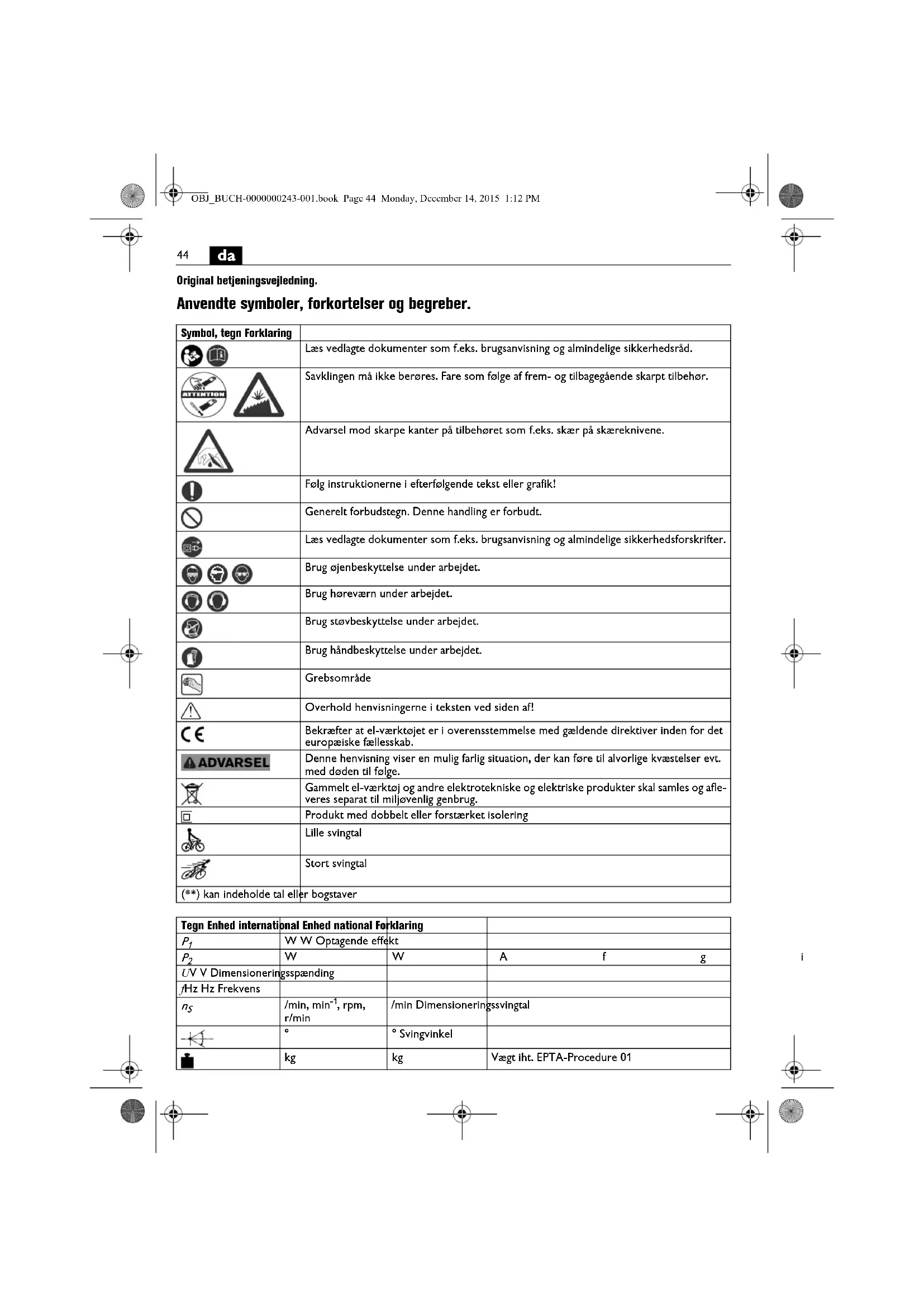 Original betjeningsvejledning. Anvendte symboler, forkortelser og begreber. Symbol, tegn Forklaring Læs vedlagte dokumenter som f.eks. brugsanvisning og almindelige sikkerhedsråd. Savklingen må ikke berøres. Fare som følge af frem- og tilbagegående skarpt tilbehør. Advarsel mod skarpe kanter på tilbehøret som f.eks. skær på skæreknivene. Følg instruktionerne i efterfølgende tekst eller grafik! Generelt forbudstegn. Denne handling er forbudt. Læs vedlagte dokumenter som f.eks. brugsanvisning og almindelige sikkerhedsforskrifter. Brug øjenbeskyttelse under arbejdet. Brug høreværn under arbejdet. Brug støvbeskyttelse under arbejdet. Brug håndbeskyttelse under arbejdet. Grebsområde Overhold henvisningerne i teksten ved siden af! Bekræfter at el-værktøjet er i overensstemmelse med gældende direktiver inden for det europæiske fællesskab. Denne henvisning viser en mulig farlig situation, der kan føre til alvorlige kvæstelser evt. med døden til følge. Gammelt el-værktøj og andre elektrotekniske og elektriske produkter skal samles og afle- veres separat til miljøvenlig genbrug. Produkt med dobbelt eller forstærket isolering Lille svingtal Stort svingtal (**) kan indeholde tal eller bogstaver Tegn Enhed international Enhed national Forklaring