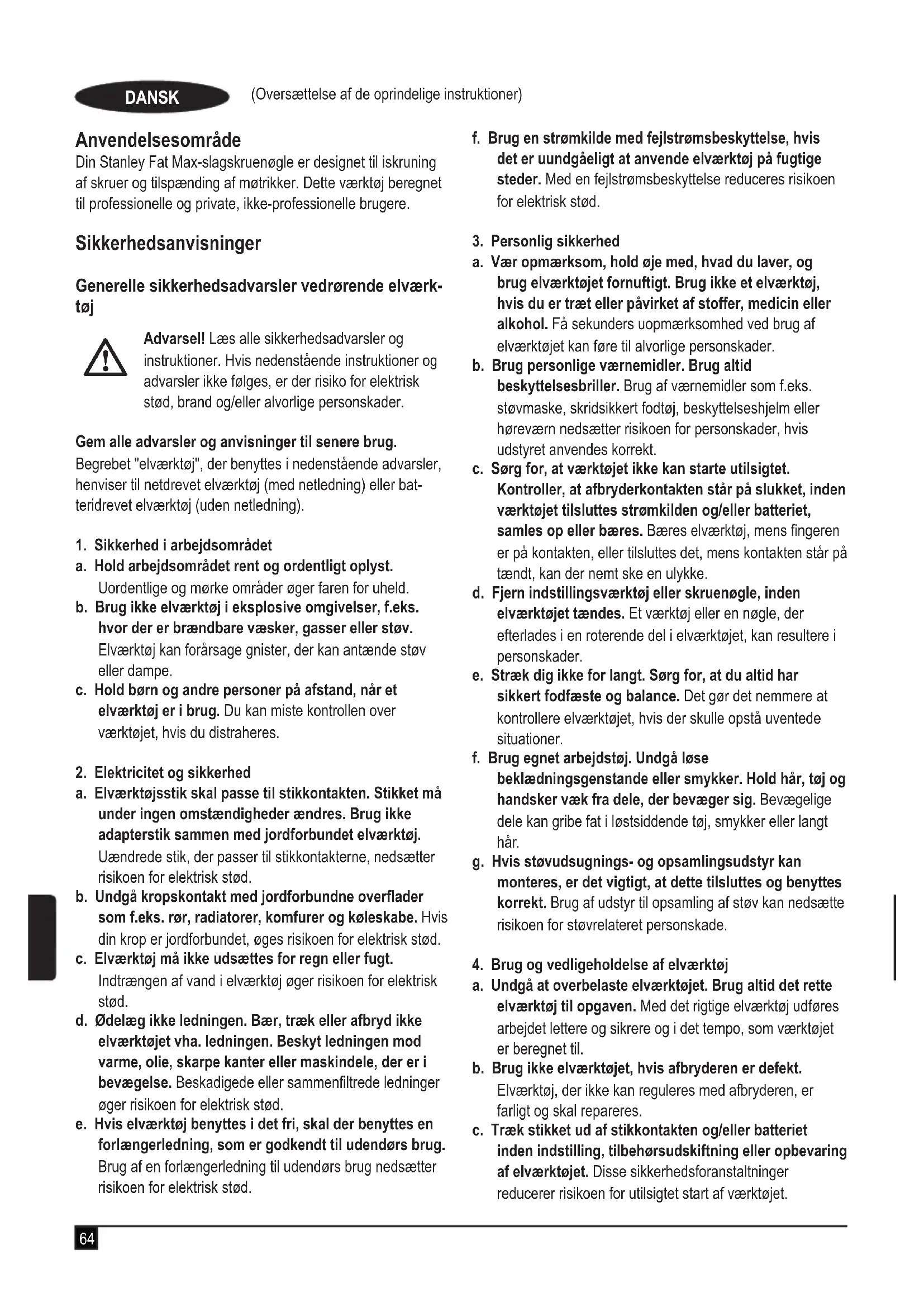 Hvis dit Stanley Fat Max-produkt går i stykker på grund af materiel skade eller fabrikationsfejl inden for 12 måneder fra købsdatoen, påtager Stanley Europe sig gratis at udskifte alle defekte dele eller efter vores skøn gratis at udskifte enheden forudsat at: u Produktet ikke har været anvendt forkert og har været anvendt i overensstemmelse med brugervejledningen. u Produktet ikke har været udsat for andet end almindelig slitage; u Reparationer ikke er udført af uautoriserede personer;u Købsbeviset kan fremvises.u Hele Stanley Fat Max-produktet returneres med alle originale komponenter Hvis du ønsker erstatning for skade, skal du kontakte forhandleren eller det nærmeste autoriserede Stanley Fat Max-værksted i Stanley Fat Max-kataloget eller kontakte dit lokale Stanley-kontor på den adresse, der er opgivet i denne vejledning. Der ndes en liste over alle autoriserede Stanley Fat Max-serviceværksteder samt servicevilkår på følgende internetadresse:www.stanley.eu/370 (Alkuperäisten ohjeiden käännös) SUOMI Käyttötarkoitus Stanley Fat Max -iskuväännin on suunniteltu ruuvaamiseen ja muttereiden asettamiseen. Tämä työkalu on tarkoitettu am- mattikäyttöön ja yksityiseen, ei ammattikäyttäjille. Turvallisuusohjeet Sähkötyökalujen yleiset turvavaroitukset