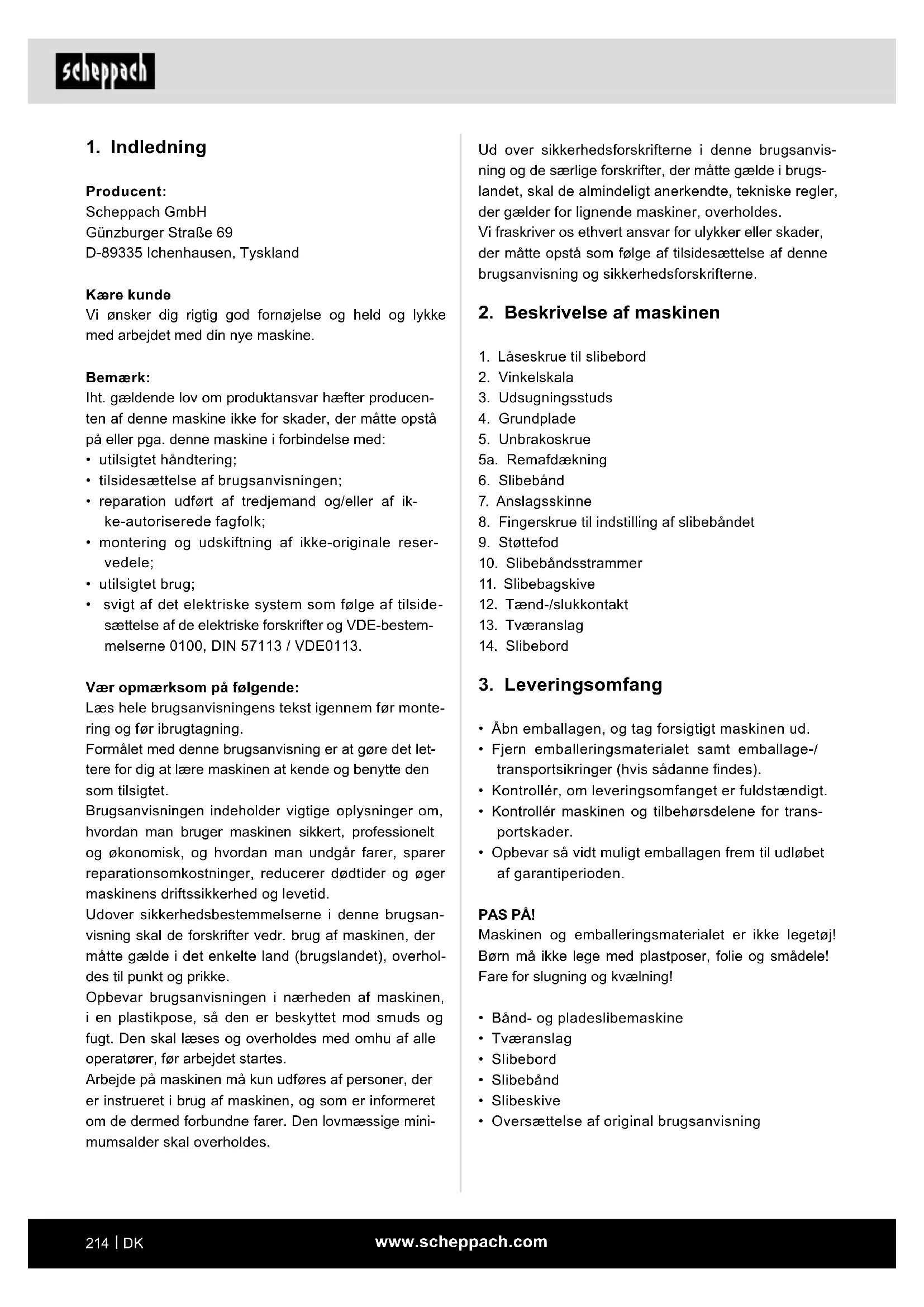Producent: Scheppach GmbH Günzburger Straße 69 D-89335 Ichenhausen, Tyskland Kære kunde Vi ønsker dig rigtig god fornøjelse og held og lykke med arbejdet med din nye maskine. Bemærk: Iht. gældende lov om produktansvar hæfter producen- ten af denne maskine ikke for skader, der måtte opstå på eller pga. denne maskine i forbindelse med: