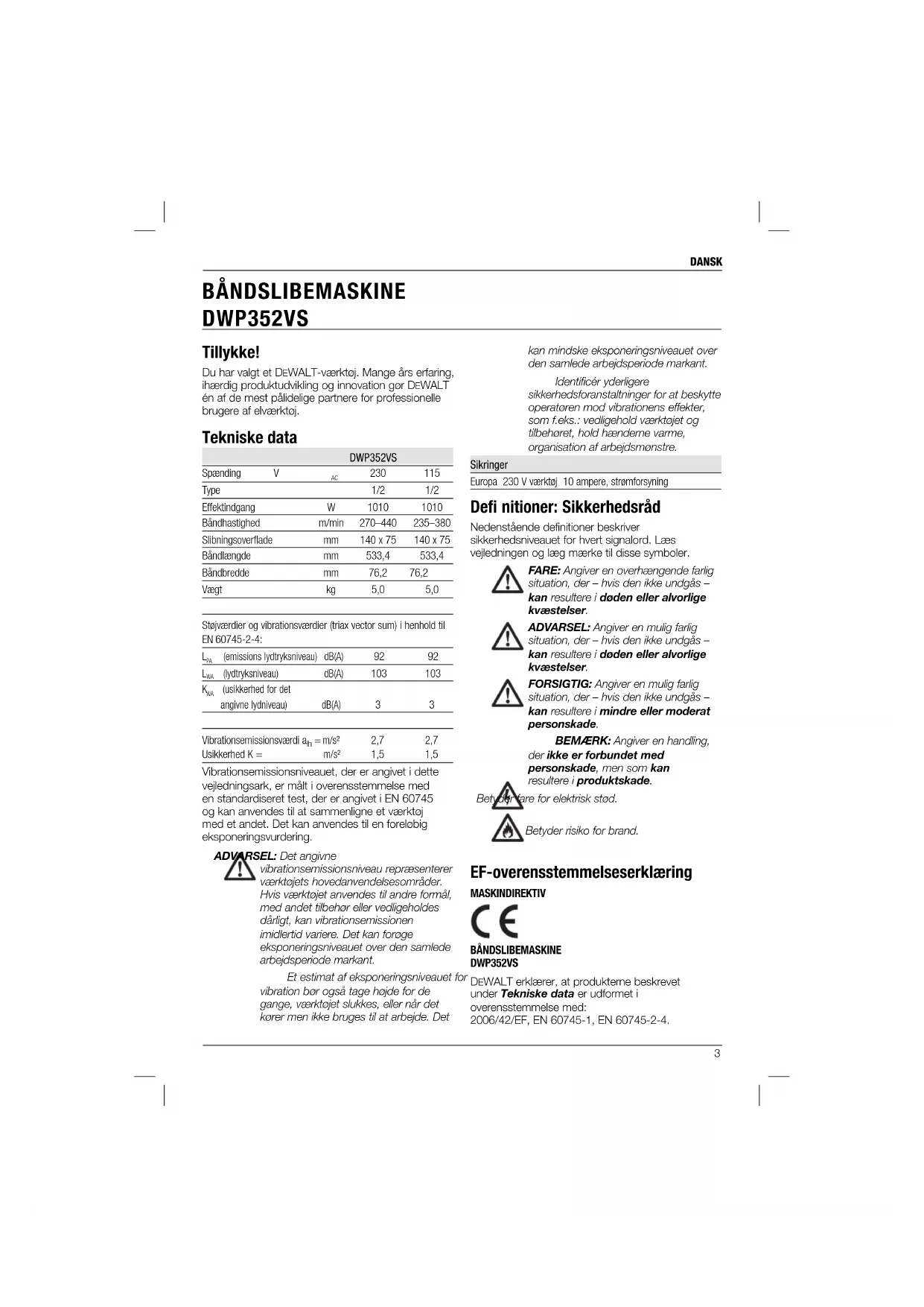 kan mindske eksponeringsniveauet over den samlede arbejdsperiode markant. Identificér yderligere sikkerhedsforanstaltninger for at beskytte operatøren mod vibrationens effekter, som f.eks.: vedligehold værktøjet og tilbehøret, hold hænderne varme, organisation af arbejdsmønstre. Sikringer Europa 230 V værktøj 10 ampere, strømforsyning Defi nitioner: Sikkerhedsråd Nedenstående definitioner beskriver sikkerhedsniveauet for hvert signalord. Læs vejledningen og læg mærke til disse symboler. FARE: Angiver en overhængende farlig situation, der – hvis den ikke undgås – kan resultere i døden eller alvorlige kvæstelser. ADVARSEL: Angiver en mulig farlig situation, der – hvis den ikke undgås – kan resultere i døden eller alvorlige kvæstelser. FORSIGTIG: Angiver en mulig farlig situation, der – hvis den ikke undgås – kan resultere i mindre eller moderat personskade. BEMÆRK: Angiver en handling, der ikke er forbundet med personskade, men som kan resultere i produktskade. Betyder fare for elektrisk stød. Betyder risiko for brand. EF-overensstemmelseserklæring MASKINDIREKTIV BÅNDSLIBEMASKINE DWP352VS DEWALT erklærer, at produkterne beskrevet under Tekniske data er udformet i overensstemmelse med: 2006/42/EF, EN 60745-1, EN 60745-2-4. Tillykke! Du har valgt et DEWALT-værktøj. Mange års erfaring, ihærdig produktudvikling og innovation gør D EWALT én af de mest pålidelige partnere for professionelle brugere af elværktøj. Tekniske data DWP352VS Spænding V