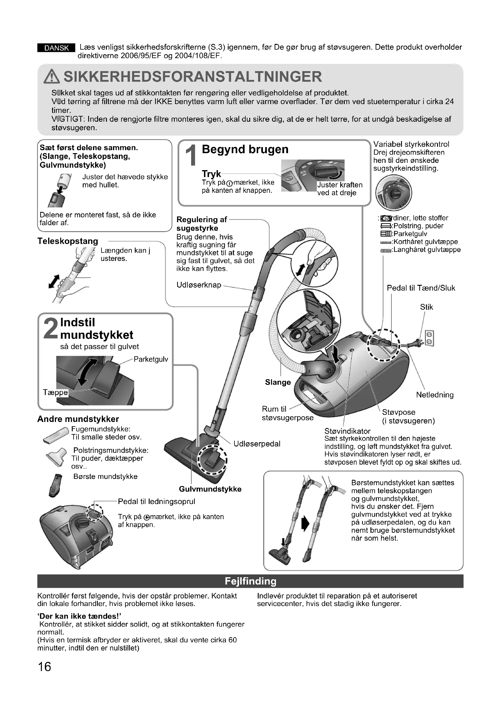DANSK For at undgå enhver risiko for antændelse, elektrisk stød eller personlig skade tilrådes det at læse nedenstående sikkerhedsforanstaltninger grundigt, inden støvsugeren sættes i gang.