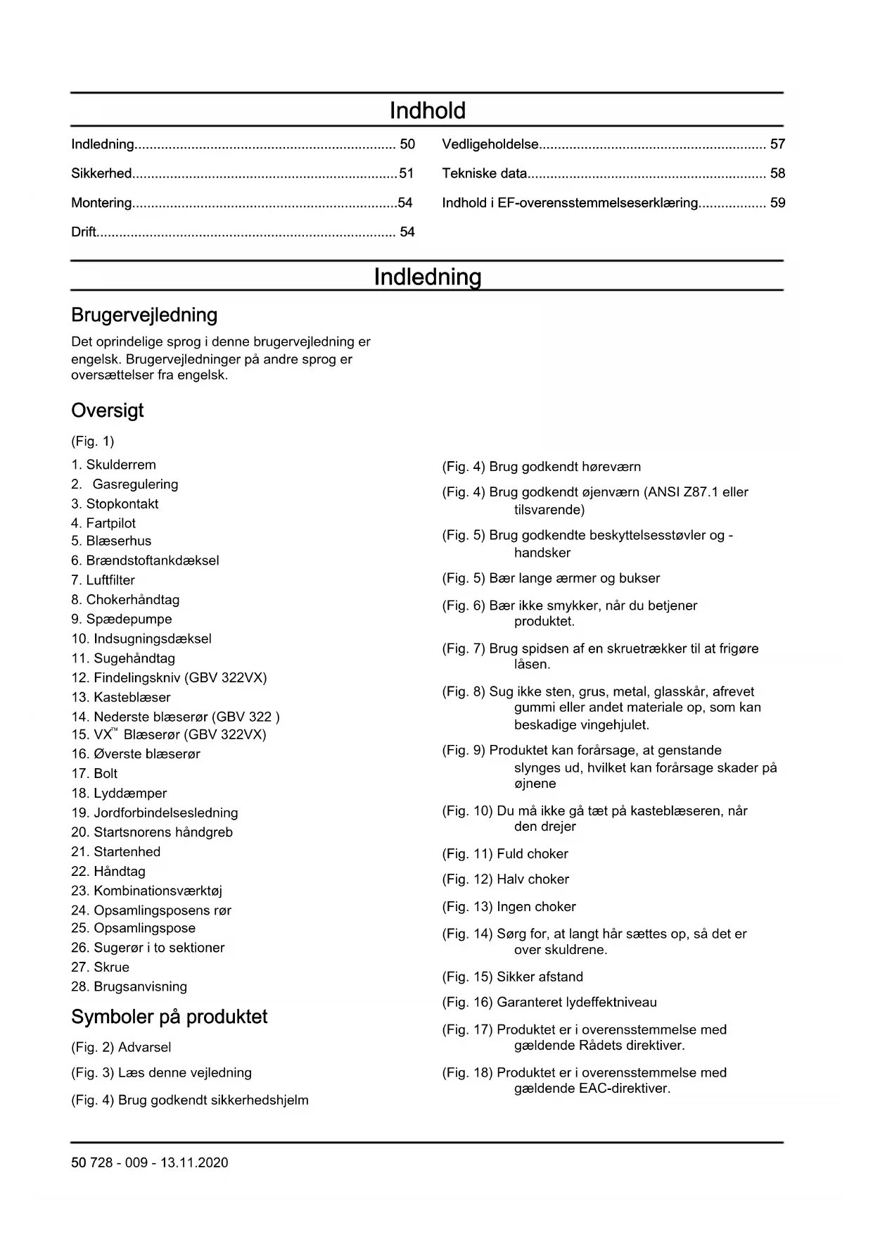 Symboler på produktet (Fig. 2) Advarsel (Fig. 3) Læs denne vejledning (Fig. 4) Brug godkendt sikkerhedshjelm (Fig. 4) Brug godkendt høreværn (Fig. 4) Brug godkendt øjenværn (ANSI Z87.1 eller tilsvarende) (Fig. 5) Brug godkendte beskyttelsesstøvler og - handsker (Fig. 5) Bær lange ærmer og bukser (Fig. 6) Bær ikke smykker, når du betjener produktet. (Fig. 7) Brug spidsen af en skruetrækker til at frigøre låsen. (Fig. 8) Sug ikke sten, grus, metal, glasskår, afrevet gummi eller andet materiale op, som kan beskadige vingehjulet. (Fig. 9) Produktet kan forårsage, at genstande slynges ud, hvilket kan forårsage skader på øjnene (Fig. 10) Du må ikke gå tæt på kasteblæseren, når den drejer (Fig. 11) Fuld choker (Fig. 12) Halv choker (Fig. 13) Ingen choker (Fig. 14) Sørg for, at langt hår sættes op, så det er over skuldrene. (Fig. 15) Sikker afstand (Fig. 16) Garanteret lydeffektniveau (Fig. 17) Produktet er i overensstemmelse med gældende Rådets direktiver. (Fig. 18) Produktet er i overensstemmelse med gældende EAC-direktiver. 50 728 - 009 - 13.11.2020(Fig. 19) Produktet er i overensstemmelse med gældende ukrainske direktiver. (Fig. 20) Produktet er i overensstemmelse med den australske lovgivning om elektromagnetisk kompatibilitet (EMC). Bemærk: Andre symboler/mærkater på produktet henviser til certificeringskrav i andre handelsområder. Euro V-emissioner ADVARSEL: Ved manipulation af motoren bortfalder EU-typegodkendelsen af dette produkt. Produktansvar Som nævnt i produktansvarsbestemmelserne hæfter vi ikke for skader forårsaget af vores produkt, hvis: