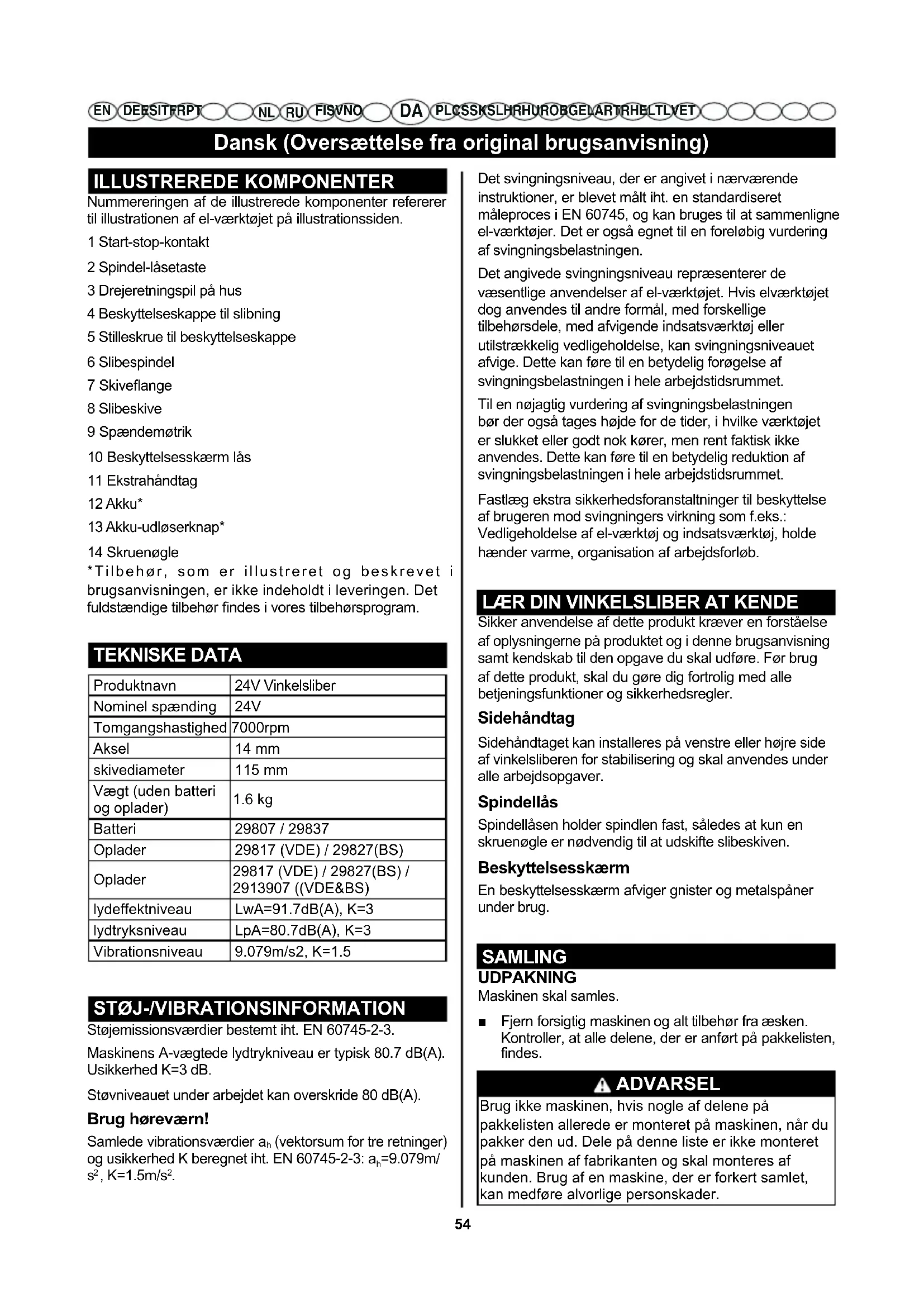 Sikker anvendelse af dette produkt kræver en forståelse af oplysningerne på produktet og i denne brugsanvisning samt kendskab til den opgave du skal udføre. Før brug af dette produkt, skal du gøre dig fortrolig med alle betjeningsfunktioner og sikkerhedsregler. Sidehåndtag Sidehåndtaget kan installeres på venstre eller højre side af vinkelsliberen for stabilisering og skal anvendes under alle arbejdsopgaver. Spindellås Spindellåsen holder spindlen fast, således at kun en skruenøgle er nødvendig til at udskifte slibeskiven. Beskyttelsesskærm En beskyttelsesskærm afviger gnister og metalspåner under brug. SAMLING UDPAKNING Maskinen skal samles. ■ Fjern forsigtig maskinen og alt tilbehør fra æsken. Kontroller, at alle delene, der er anført på pakkelisten, findes. ADVARSEL Brug ikke maskinen, hvis nogle af delene på pakkelisten allerede er monteret på maskinen, når du pakker den ud. Dele på denne liste er ikke monteret på maskinen af fabrikanten og skal monteres af kunden. Brug af en maskine, der er forkert samlet, kan medføre alvorlige personskader.Dansk (Oversættelse fra original brugsanvisning)