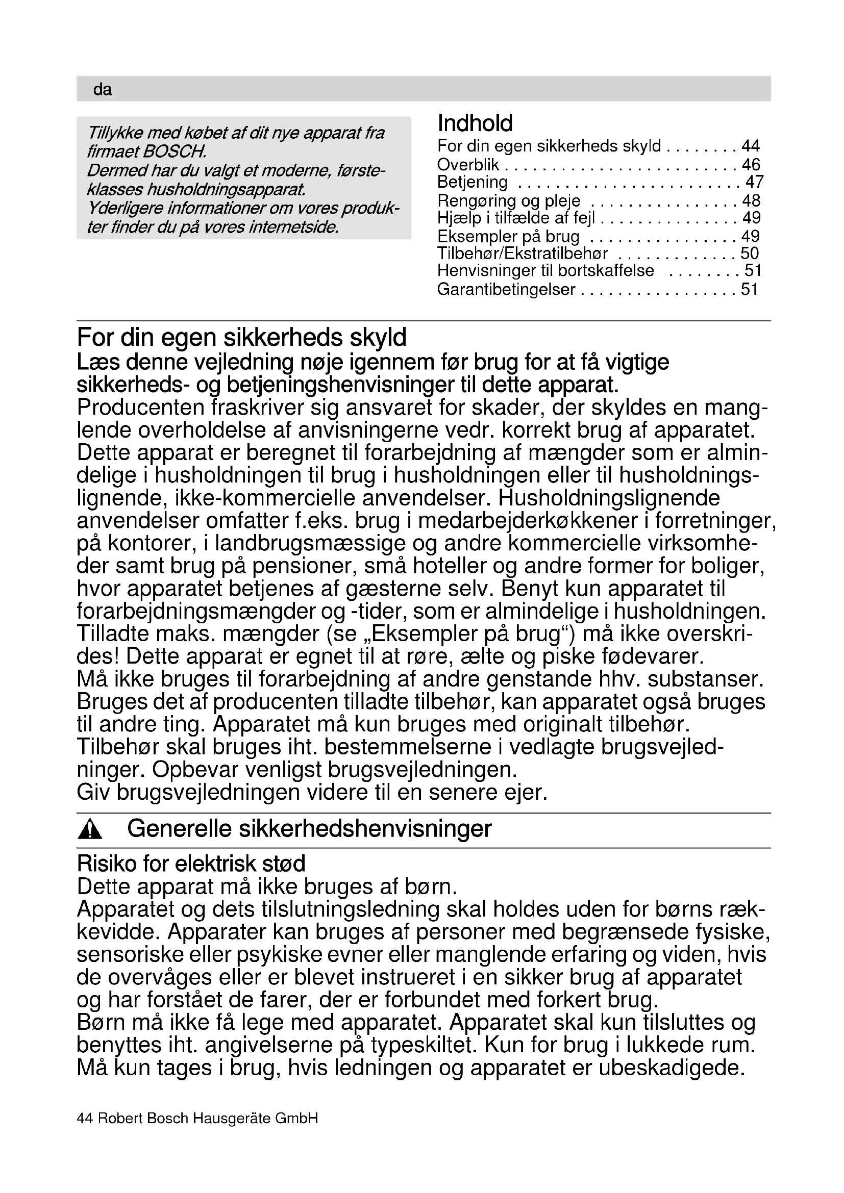 - Garantibetingelser For din egen sikkerheds skyld Læs denne vejledning nøje igennem før brug for at få vigtige sikkerheds- og betjeningshenvisninger til dette apparat. Producenten fraskriver sig ansvaret for skader, der skyldes en mang- lende overholdelse af anvisningerne vedr. korrekt brug af apparatet. Dette apparat er beregnet til forarbejdning af mængder som er almin- delige i husholdningen til brug i husholdningen eller til husholdnings- lignende, ikke-kommercielle anvendelser. Husholdningslignende anvendelser omfatter f.eks. brug i medarbejderkøkkener i forretninger, på kontorer, i landbrugsmæssige og andre kommercielle virksomhe- der samt brug på pensioner, små hoteller og andre former for boliger, hvor apparatet betjenes af gæsterne selv. Benyt kun apparatet til forarbejdningsmængder og -tider, som er almindelige i husholdningen. Tilladte maks. mængder (se „Eksempler på brug“) må ikke overskri- des! Dette apparat er egnet til at røre, ælte og piske fødevarer. Må ikke bruges til forarbejdning af andre genstande hhv. substanser. Bruges det af producenten tilladte tilbehør, kan apparatet også bruges til andre ting. Apparatet må kun bruges med originalt tilbehør. Tilbehør skal bruges iht. bestemmelserne i vedlagte brugsvejled- ninger. Opbevar venligst brugsvejledningen. Giv brugsvejledningen videre til en senere ejer. , Generelle sikkerhedshenvisninger Risiko for elektrisk stød Dette apparat må ikke bruges af børn. Apparatet og dets tilslutningsledning skal holdes uden for børns ræk- kevidde. Apparater kan bruges af personer med begrænsede fysiske, sensoriske eller psykiske evner eller manglende erfaring og viden, hvis de overvåges eller er blevet instrueret i en sikker brug af apparatet og har forstået de farer, der er forbundet med forkert brug. Børn må ikke få lege med apparatet. Apparatet skal kun tilsluttes og benyttes iht. angivelserne på typeskiltet. Kun for brug i lukkede rum. Må kun tages i brug, hvis ledningen og apparatet er ubeskadigede. p. 51