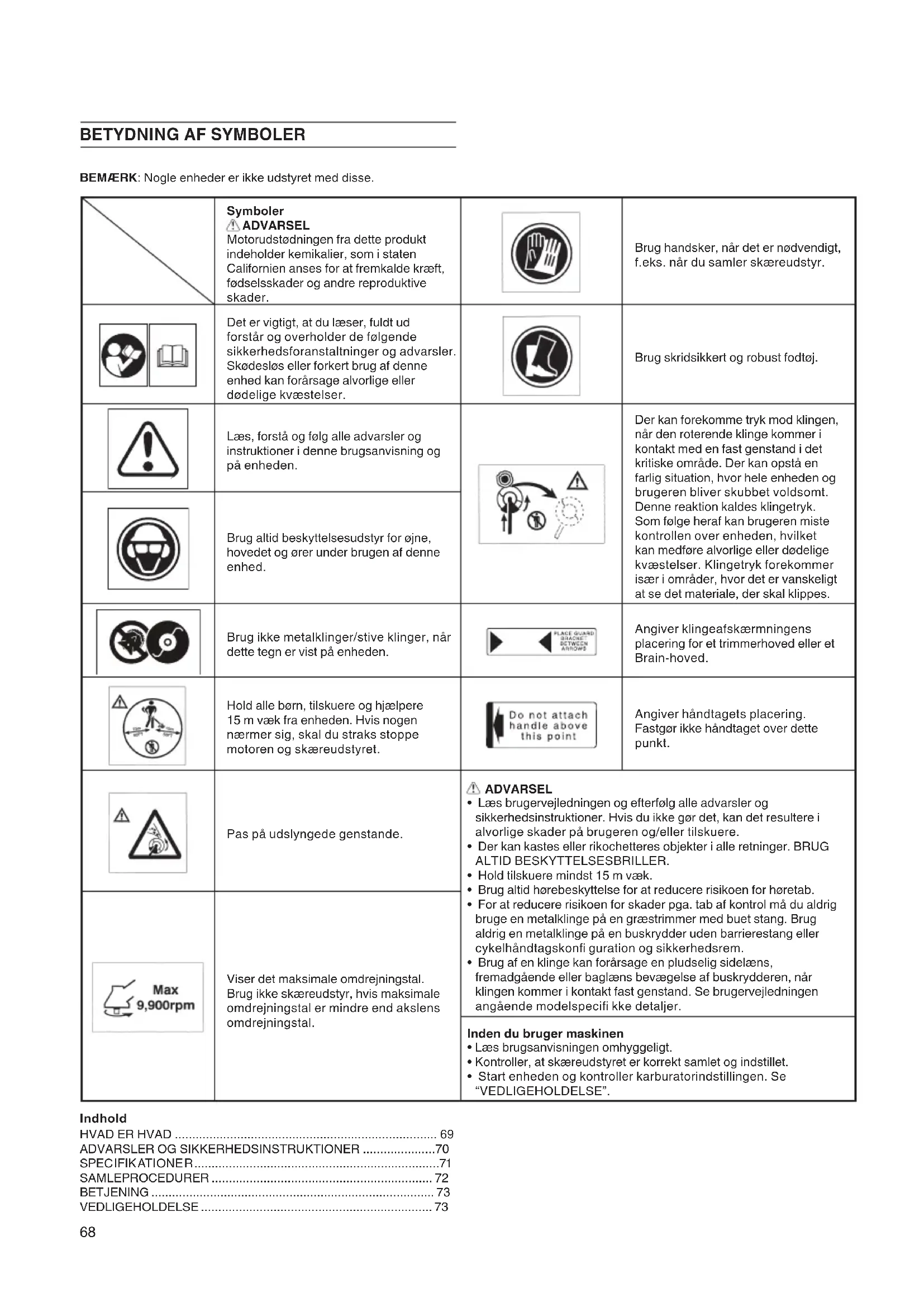 BEMÆRK: Nogle enheder er ikke udstyret med disse. Symboler ADVARSEL Motorudstødningen fra dette produkt indeholder kemikalier, som i staten Californien anses for at fremkalde kræft, fødselsskader og andre reproduktive skader. Brug handsker, når det er nødvendigt, f.eks. når du samler skæreudstyr. Det er vigtigt, at du læser, fuldt ud forstår og overholder de følgende sikkerhedsforanstaltninger og advarsler. Skødesløs eller forkert brug af denne enhed kan forårsage alvorlige eller dødelige kvæstelser. Brug skridsikkert og robust fodtøj. Læs, forstå og følg alle advarsler og instruktioner i denne brugsanvisning og på enheden. Der kan forekomme tryk mod klingen, når den roterende klinge kommer i kontakt med en fast genstand i det kritiske område. Der kan opstå en farlig situation, hvor hele enheden og brugeren bliver skubbet voldsomt. Denne reaktion kaldes klingetryk. Som følge heraf kan brugeren miste kontrollen over enheden, hvilket kan medføre alvorlige eller dødelige kvæstelser. Klingetryk forekommer især i områder, hvor det er vanskeligt at se det materiale, der skal klippes. Brug altid beskyttelsesudstyr for øjne, hovedet og ører under brugen af denne enhed. Brug ikke metalklinger/stive klinger, når dette tegn er vist på enheden. Angiver klingeafskærmningens placering for et trimmerhoved eller et Brain-hoved. Hold alle børn, tilskuere og hjælpere 15 m væk fra enheden. Hvis nogen nærmer sig, skal du straks stoppe motoren og skæreudstyret. Angiver håndtagets placering. Fastgør ikke håndtaget over dette punkt. Pas på udslyngede genstande. ADVARSEL