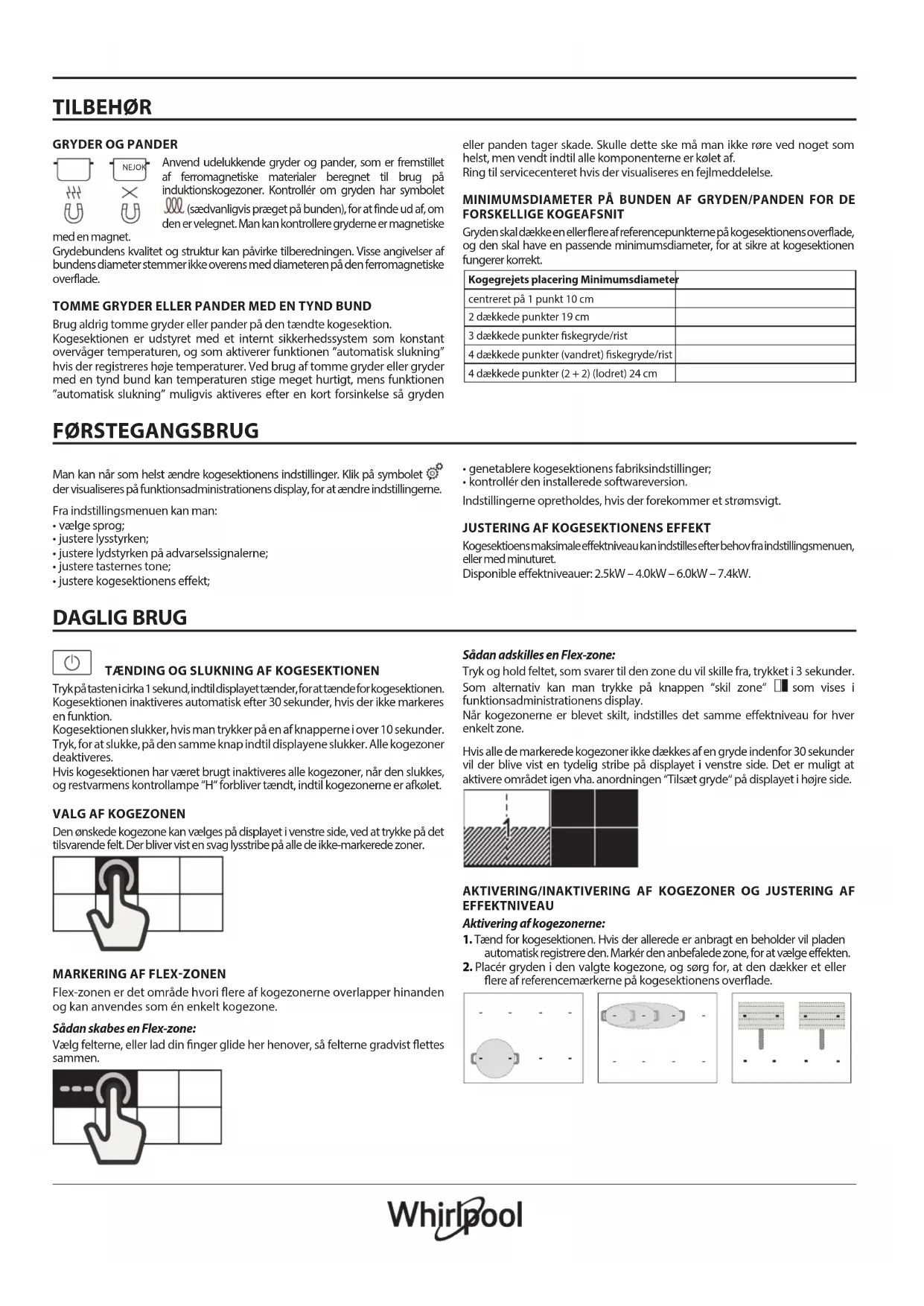 Anvend udelukkende gryder og pander, som er fremstillet af ferromagnetiske materialer beregnet til brug på induktionskogezoner. Kontrollér om gryden har symbolet (sædvanligvis præget på bunden), for at finde ud af, om den er velegnet. Man kan kontrollere gryderne er magnetiske med en magnet. Grydebundens kvalitet og struktur kan påvirke tilberedningen. Visse angivelser af bundens diameter stemmer ikke overens med diameteren på den ferromagnetiske overflade. TOMME GRYDER ELLER PANDER MED EN TYND BUND Brug aldrig tomme gryder eller pander på den tændte kogesektion. Kogesektionen er udstyret med et internt sikkerhedssystem som konstant overvåger temperaturen, og som aktiverer funktionen ”automatisk slukning” hvis der registreres høje temperaturer. Ved brug af tomme gryder eller gryder med en tynd bund kan temperaturen stige meget hurtigt, mens funktionen ”automatisk slukning” muligvis aktiveres efter en kort forsinkelse så gryden NEJOK eller panden tager skade. Skulle dette ske må man ikke røre ved noget som helst, men vendt indtil alle komponenterne er kølet af. Ring til servicecenteret hvis der visualiseres en fejlmeddelelse. MINIMUMSDIAMETER PÅ BUNDEN AF GRYDEN/PANDEN FOR DE FORSKELLIGE KOGEAFSNIT Gryden skal dække en eller flere af referencepunkterne på kogesektionens overflade, og den skal have en passende minimumsdiameter, for at sikre at kogesektionen fungerer korrekt. Kogegrejets placering Minimumsdiameter centreret på 1 punkt 10 cm 2 dækkede punkter 19 cm 3 dækkede punkter skegryde/rist 4 dækkede punkter (vandret) skegryde/rist 4 dækkede punkter (2 + 2) (lodret) 24 cm FØRSTEGANGSBRUG Man kan når som helst ændre kogesektionens indstillinger. Klik på symbolet , der visualiseres på funktionsadministrationens display, for at ændre indstillingerne. Fra indstillingsmenuen kan man: