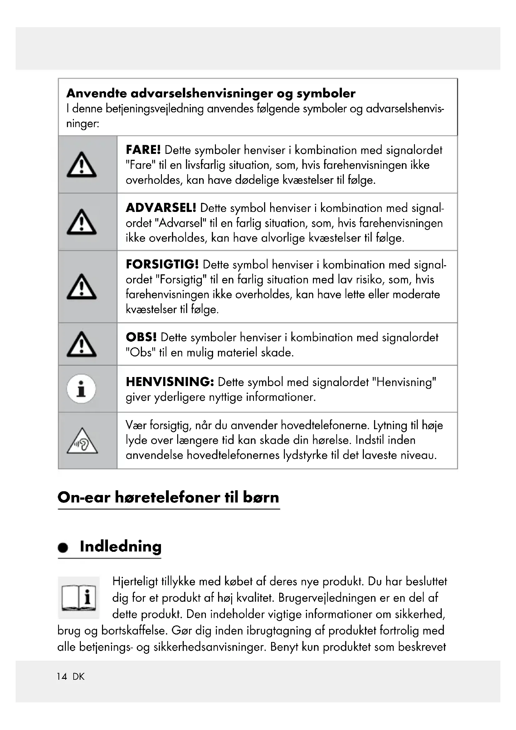 Bøjle Tekniske data Mål: ca. 162 mm x 145 mm x 63 mm Vægt: ca. 105 g Længde audiokabel: ca. 175 cm Driftstemperatur: 5 °C – 35 °C Luftfugtighed (ingen kondensering): 10 % – 70 % Opbevaringstemperatur: 0 °C – 40 °C Bredbåndskendingsspænding (WBCV): 3,6 V ± 10 % Højtaler Driverstørrelse: 30 mm Impedans: 32 Ω ± 10 Ω Følsomhed: 80 dBA ± 5 dB Frekvenskarakteristik: 20 Hz til 20 kHz17 DK Generelle sikkerhedshenvisninger Gør Dem fortrolig med alle betjenings- og sikkerhedshenvisninger, inden pro- duktet tages i brug første gang! Hvis De giver produktet videre til tredjemand, så skal alt materiale ligeledes følge med! FARE LIVS- OG ULYKKESFARE FOR SMÅBØRN OG BØRN! FARE Kvælningsfare! Lad børn aldrig være uden opsyn med emballagen. Der består kvælningsfare på grund af emballagematerialet. Børn undervur- derer hyppigt farerne. Emballagen er ikke noget legetøj. Dette produkt kan benyttes af børn fra 6-årsalderen og opad, samt af per- soner med forringede fysiske, følelsesmæssige eller mentale evner eller mangel på erfaring og viden, når de er under opsyn eller er blevet vejledt med hensyn til produktet og forstår de deraf resulterende farer. Børn må ikke lege med produktet. Rengøring og brugervedligeholdelse må ikke gennemføres af børn uden at være under opsyn. Produktet er ikke legetøj.