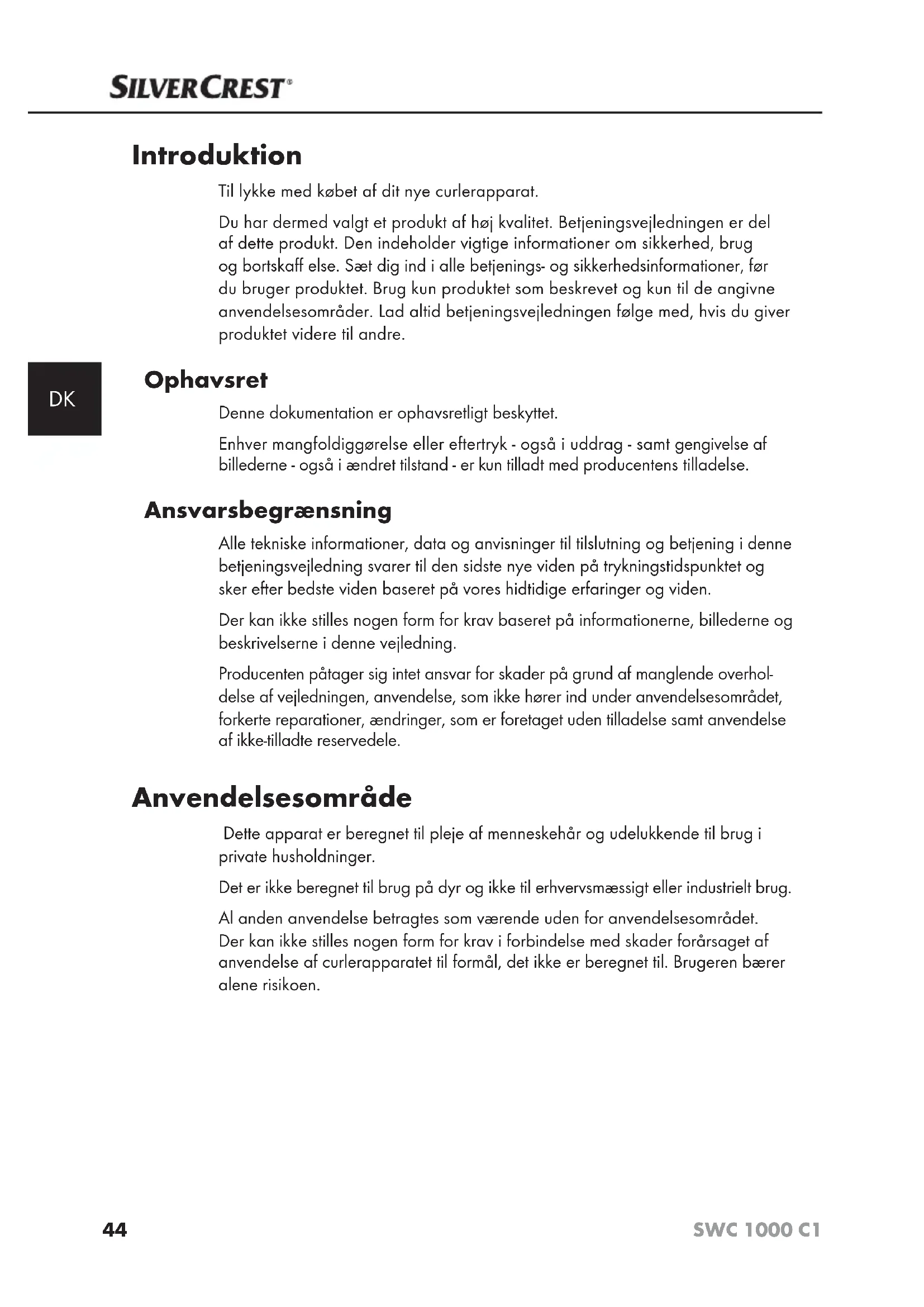 Introduktion Til lykke med købet af dit nye curlerapparat. Du har dermed valgt et produkt af høj kvalitet. Betjeningsvejledningen er del af dette produkt. Den indeholder vigtige informationer om sikkerhed, brug og bortskaff else. Sæt dig ind i alle betjenings- og sikkerhedsinformationer, før du bruger produktet. Brug kun produktet som beskrevet og kun til de angivne anvendelsesområder. Lad altid betjeningsvejledningen følge med, hvis du giver produktet videre til andre. Ophavsret Denne dokumentation er ophavsretligt beskyttet. Enhver mangfoldiggørelse eller eftertryk - også i uddrag - samt gengivelse af billederne - også i ændret tilstand - er kun tilladt med producentens tilladelse. Ansvarsbegrænsning Alle tekniske informationer, data og anvisninger til tilslutning og betjening i denne betjeningsvejledning svarer til den sidste nye viden på trykningstidspunktet og sker efter bedste viden baseret på vores hidtidige erfaringer og viden. Der kan ikke stilles nogen form for krav baseret på informationerne, billederne og beskrivelserne i denne vejledning. Producenten påtager sig intet ansvar for skader på grund af manglende overhol- delse af vejledningen, anvendelse, som ikke hører ind under anvendelsesområdet, forkerte reparationer, ændringer, som er foretaget uden tilladelse samt anvendelse af ikke-tilladte reservedele. Anvendelsesområde Dette apparat er beregnet til pleje af menneskehår og udelukkende til brug i private husholdninger. Det er ikke beregnet til brug på dyr og ikke til erhvervsmæssigt eller industrielt brug. Al anden anvendelse betragtes som værende uden for anvendelsesområdet. Der kan ikke stilles nogen form for krav i forbindelse med skader forårsaget af anvendelse af curlerapparatet til formål, det ikke er beregnet til. Brugeren bærer alene risikoen. IB_107211_SWC1000C1_FI_DK_BE_NL.indb 44 10.03.15 15:3545 SWC 1000 C1