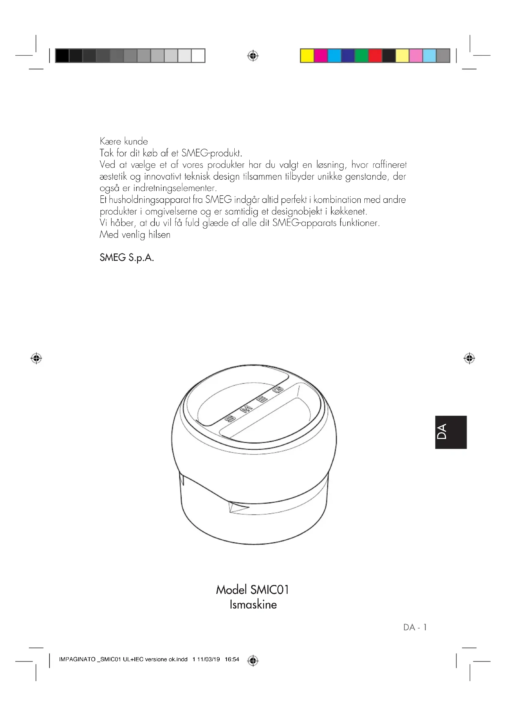 - Поставить миску в холодильник и оста- вить до тех пор, пока смесь не остынет до температуры холодильника. IMPAGINATO _SMIC01 UL+IEC versione ok.indd 7 11/03/19 16:548 - RU IMPAGINATO _SMIC01 UL+IEC versione ok.indd 8 11/03/19 16:54DA DA - 1 Kære kunde Tak for dit køb af et SMEG-produkt. Ved at vælge et af vores produkter har du valgt en løsning, hvor raffineret æstetik og innovativt teknisk design tilsammen tilbyder unikke genstande, der også er indretningselementer. Et husholdningsapparat fra SMEG indgår altid perfekt i kombination med andre produkter i omgivelserne og er samtidig et designobjekt i køkkenet. Vi håber, at du vil få fuld glæde af alle dit SMEG-apparats funktioner. Med venlig hilsen SMEG S.p.A. Model SMIC01 Ismaskine IMPAGINATO _SMIC01 UL+IEC versione ok.indd 1 11/03/19 16:542 - DA Advarsler SIKKERHED Generelle sikkerhedsadvarsler Brug kun ismaskinens tilbehør i kombination producentens miksermodeller i serien SMF. For fuldstændig information om brugen af mikseren henvises til brugsanvisningen, der følger med apparatet.
