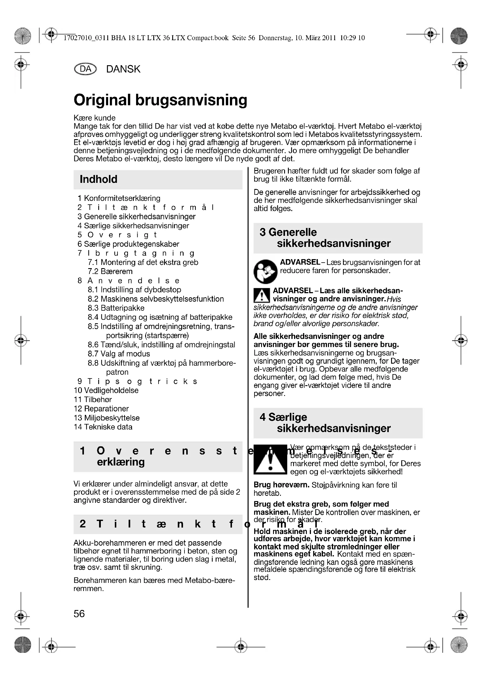 ær opmærksom på de tekststeder i betjeningsvejledningen, der er markeret med dette symbol, for Deres egen og el-værktøjets sikkerhed! Brug høreværn. Støjpåvirkning kan føre til høretab. Brug det ekstra greb, som følger med maskinen. Mister De kontrollen over maskinen, er der risiko for skader. Hold maskinen i de isolerede greb, når der udføres arbejde, hvor værktøjet kan komme i kontakt med skjulte strømledninger eller maskinens eget kabel. Kontakt med en spæn- dingsførende ledning kan også gøre maskinens metaldele spændingsførende og føre til elektrisk stød. Original brugsanvisning Kære kunde Mange tak for den tillid De har vist ved at købe dette nye Metabo el-værktøj. Hvert Metabo el-værktøj afprøves omhyggeligt og underligger streng kvalitetskontrol som led i Metabos kvalitetsstyringssystem. Et el-værktøjs levetid er dog i høj grad afhængig af brugeren. Vær opmærksom på informationerne i denne betjeningsvejledning og i de medfølgende dokumenter. Jo mere omhyggeligt De behandler Deres Metabo el-værktøj, desto længere vil De nyde godt af det. Indhold 1Overensstemmelses- erklæring 2Tiltænkt formål 3 Generelle sikkerhedsanvisninger 4 Særlige sikkerhedsanvisninger 17027010_0311 BHA 18 LT LTX 36 LTX Compact.book Seite 56 Donnerstag, 10. März 2011 10:29 10DANSK