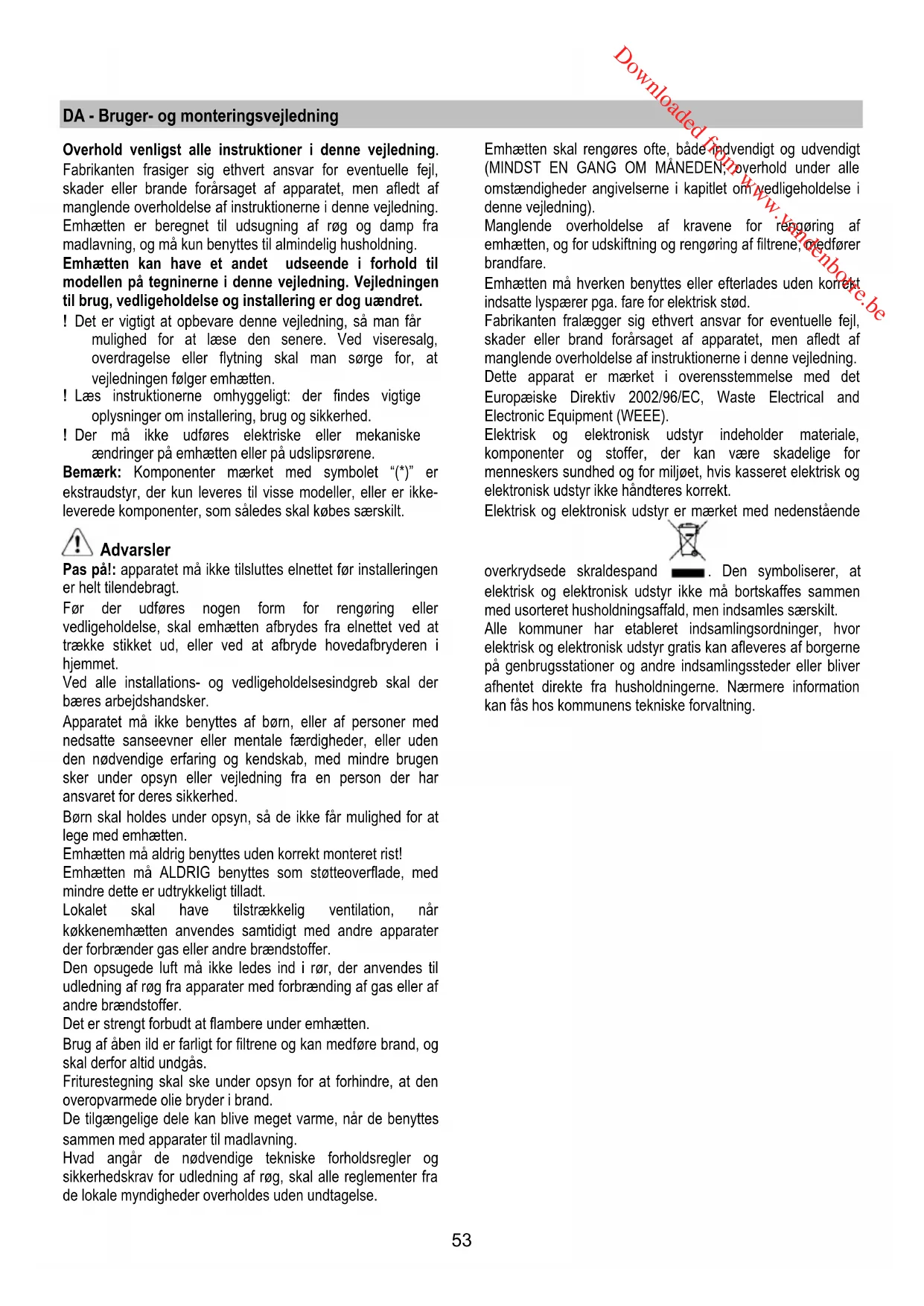 Trykk knappen inn i 3 sekunder, og den elektroniske betjeningen av ventilatorhetten utelukkes. Denne funksjonen kan være nyttig mens du rengjører produktet. For å gjenaktivere den elektroniske betjeningen er det tilstrekkelig å repetere operasjonen. I tilfelle eventuell unormal funksjon av apparatet, før du henvender deg til kundeservice anbefaler vi å koble apparatet fra strømnettet i minst 5 sekunder ved å dra kontakten ut av støpselet, og deretter koble det til igjen. I tilfelle unormal funksjon skulle fortsette, må man henvende seg til kundeservice. Vedlikehold Advarsel! Før enhver form for rengjøring eller vedlikehold må ventilatorhetten frakobles strømnettet ved å dra ut ledningen eller slå av husets hovedstrømbryter. Rengjøring Ventilatoren må rengjøres jevnlig, både innvendig og utvendig (minst så ofte som man utfører vedlikehold av fettfiltrene). Til rengjøring benyttes en klut fuktet med et nøytralt rengjøringsmiddel. Unngå bruk av slipende eller etsende produkter. Advarsel: Hvis ikke reglene for rengjøring og utskifting av filtrene følges, kan det føre til brann. Det er derfor meget viktig å følge denne bruksanvisningen nøye. Produsenten fraskriver seg ethvert ansvar for eventuelle skader på motoren, brann som skyldes manglende vedlikehold eller andre skader som skyldes at instruksene over ikke er blitt fulgt. Fettfilteret - Fig. 19-25 Fanger kokefettpartikler. Dette må rengjøres en gang i måneden (eller når det elektroniske systemet viser at filteret er skittent – hvis din modell har denne funksjonen), med milde (ikke aggressive) rengjøringsmidler, for hånd eller i oppvaskmaskin ved lav temperatur og med kort syklus. Ved vask i oppvaskmaskin kan fettfilteret i metall miste fargen, men dets filterkarakteristikker endres absolutt ikke. For å demontere fettfilteret må man dra i fjærhåndtaket. Kullfilter (kun med resirkulering av luften) - Fig. 23 Holder tilbake ubehagelige lukter fra matlaging. Kullfilteret kan rengjøres annenhver måned (eller når systemet for varsling om skitne filtre – om dette er forutsett på modellen man har – viser at rengjøring er nødvendig), i varmt vann og med egnet rengjøringsmiddel, eller i oppvaskmaskin på 65 °C (ved rengjøring i oppvaskmaskin skal filteret vaskes på full syklus uten annen oppvask i maskinen). Klem vannet forsiktig ut av filteret uten å ødelegge det, og legg det deretter i stekeovnen i 10 minutter ved 100 °C for å tørke det ordentlig. Skift ut filterputen hvert 3. år og hver gang stoffet er skadet. Utskifting av lyspærer Ventilatoren er utstyrt med et belysningssystem basert på LED-teknologi. LED-lysene garanterer optimal belysning, har opptil 10 ganger lengre varighet enn tradisjonelle lyspærer og tillater en strømsparing på 90 %. Henvend deg til teknisk service når LED-pærene skal skiftes ut. Downloaded from www.vandenborre.be53 DA - Bruger- og monteringsvejledning Overhold venligst alle instruktioner i denne vejledning. Fabrikanten frasiger sig ethvert ansvar for eventuelle fejl, skader eller brande forårsaget af apparatet, men afledt af manglende overholdelse af instruktionerne i denne vejledning. Emhætten er beregnet til udsugning af røg og damp fra madlavning, og må kun benyttes til almindelig husholdning. Emhætten kan have et andet udseende i forhold til modellen på tegninerne i denne vejledning. Vejledningen til brug, vedligeholdelse og installering er dog uændret. ! Det er vigtigt at opbevare denne vejledning, så man får mulighed for at læse den senere. Ved viseresalg, overdragelse eller flytning skal man sørge for, at vejledningen følger emhætten. ! Læs instruktionerne omhyggeligt: der findes vigtige oplysninger om installering, brug og sikkerhed. ! Der må ikke udføres elektriske eller mekaniske ændringer på emhætten eller på udslipsrørene. Bemærk: Komponenter mærket med symbolet “(*)” er ekstraudstyr, der kun leveres til visse modeller, eller er ikke- leverede komponenter, som således skal købes særskilt. Advarsler Pas på!: apparatet må ikke tilsluttes elnettet før installeringen er helt tilendebragt. Før der udføres nogen form for rengøring eller vedligeholdelse, skal emhætten afbrydes fra elnettet ved at trække stikket ud, eller ved at afbryde hovedafbryderen i hjemmet. Ved alle installations- og vedligeholdelsesindgreb skal der bæres arbejdshandsker. Apparatet må ikke benyttes af børn, eller af personer med nedsatte sanseevner eller mentale færdigheder, eller uden den nødvendige erfaring og kendskab, med mindre brugen sker under opsyn eller vejledning fra en person der har ansvaret for deres sikkerhed. Børn skal holdes under opsyn, så de ikke får mulighed for at lege med emhætten. Emhætten må aldrig benyttes uden korrekt monteret rist! Emhætten må ALDRIG benyttes som støtteoverflade, med mindre dette er udtrykkeligt tilladt. Lokalet skal have tilstrækkelig ventilation, når køkkenemhætten anvendes samtidigt med andre apparater der forbrænder gas eller andre brændstoffer. Den opsugede luft må ikke ledes ind i rør, der anvendes til udledning af røg fra apparater med forbrænding af gas eller af andre brændstoffer. Det er strengt forbudt at flambere under emhætten. Brug af åben ild er farligt for filtrene og kan medføre brand, og skal derfor altid undgås. Friturestegning skal ske under opsyn for at forhindre, at den overopvarmede olie bryder i brand. De tilgængelige dele kan blive meget varme, når de benyttes sammen med apparater til madlavning. Hvad angår de nødvendige tekniske forholdsregler og sikkerhedskrav for udledning af røg, skal alle reglementer fra de lokale myndigheder overholdes uden undtagelse. Emhætten skal rengøres ofte, både indvendigt og udvendigt (MINDST EN GANG OM MÅNEDEN; overhold under alle omstændigheder angivelserne i kapitlet om vedligeholdelse i denne vejledning). Manglende overholdelse af kravene for rengøring af emhætten, og for udskiftning og reng