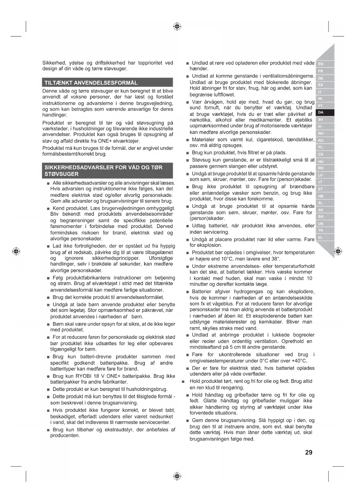 Denne våde og tørre støvsuger er kun beregnet til at blive anvendt af voksne personer, der har læst og forstået instruktionerne og advarslerne i denne brugsvejledning, og som kan betragtes som værende ansvarlige for deres handlinger. Produktet er beregnet til tør og våd støvsugning på værksteder, i husholdninger og tilsvarende ikke industrielle anvendelser. Produktet kan også bruges til opsugning af støv og affald direkte fra ONE+ elværktøjer. Produktet må kun bruges til de formål, der er angivet under formålsbestemt/korrekt brug. SIKKERHEDSADVARSLER FOR VÅD OG TØR STØVSUGER ■ Alle sikkerhedsadvarsler og alle anvisninger skal læses. Hvis advarslen og instruktionerne ikke følges, kan det medføre elektrisk stød og/eller alvorlig personskade. Gem alle advarsler og brugsanvisninger til senere brug. ■ Kend produktet. Læs brugervejledningen omhyggeligt. Bliv bekendt med produktets anvendelsesområder og begrænsninger samt de specifikke potentielle faremomenter i forbindelse med produktet. Derved formindskes risikoen for brand, elektrisk stød og alvorlige personskader. ■ Lad ikke fortroligheden, der er opstået ud fra hyppig brug af et redskab, påvirke dig til at være tilbagelænet og ignorere sikkerhedsprincipper. Uforsigtige handlinger, selv i brøkdele af sekunder, kan medføre alvorlige personskader. ■ Følg produktfabrikantens instruktioner om betjening og strøm. Brug af elværktøjet i strid med det tiltænkte anvendelsesformål kan medføre farlige situationer. ■ Brug det korrekte produkt til anvendelsesformålet. ■ Undgå at lade børn anvende produktet eller benytte det som legetøj. Stor opmærksomhed er påkrævet, når produktet anvendes i nærheden af børn. ■ Børn skal være under opsyn for at sikre, at de ikke leger med produktet. ■ For at reducere faren for personskade og elektrisk stød bør produktet ikke udsættes for leg eller opbevares tilgængeligt for børn. ■ Brug kun batteri-drevne produkter sammen med specifikt godkendt batteripakke. Brug af andre batterityper kan medføre fare for brand. ■ Brug kun RYOBI 18 V ONE+ batteripakke. Brug ikke batteripakker fra andre fabrikanter. ■ Dette produkt er kun beregnet til husholdningsbrug. ■ Dette produkt må kun benyttes til det tilsigtede formål - som beskrevet i denne brugsanvisning. ■ Hvis produktet ikke fungerer korrekt, er blevet tabt, beskadiget, efterladt udendørs eller været nedsunket i vand, skal det indleveres til nærmeste servicecenter. ■ Brug kun tilbehør og ekstraudstyr, der anbefales af producenten. ■ Undlad at røre ved opladeren eller produktet med våde hænder. ■ Undlad at komme genstande i ventilationsåbningerne. Undlad at bruge produktet med blokerede åbninger. Hold åbninger fri for støv, fnug, hår og andet, som kan begrænse luftflowet. ■ Vær årvågen, hold øje med, hvad du gør, og brug sund fornuft, når du benytter et værktøj. Undlad at bruge værktøjet, hvis du er træt eller påvirket af narkotika, alkohol eller medikamenter. Et øjebliks uopmærksomhed under brug af motoriserede værktøjer kan medføre alvorlige personskader. ■ Materialer som varmt kul, cigaretskod, tændstikker, osv. må aldrig opsuges. ■ Brug kun produktet, hvis filtret er på plads. ■ Støvsug kun genstande, er er tilstrækkeligt små til at passere gennem slangen eller udstyret. ■ Undgå at bruge produktet til at opsamle hårde genstande som søm, skruer, mønter, osv. Fare for (person)skader. ■ Brug ikke produktet til opsugning af brændbare eller antændelige væsker som benzin, og brug ikke produktet, hvor disse kan forekomme. ■ Undgå at bruge produktet til at opsamle hårde genstande som søm, skruer, mønter, osv. Fare for (person)skader. ■ Udtag batteriet, når produktet ikke anvendes, eller inden servicering. ■ Undgå at placere produktet nær ild eller varme. Fare for eksplosion. ■ Produktet bør oplades i omgivelser, hvor temperaturen er højere end 10°C, men lavere end 38°. ■ Under ekstreme anvendelses- eller temperaturforhold kan det ske, at batteriet lækker. Hvis væske kommer i kontakt med huden, skal man vaske i mindst 10 minutter og derefter kontakte læge. ■ Batterier afgiver hydrogengas og kan eksplodere, hvis de kommer i nærheden af en antændelseskilde som fx et vågeblus. For at reducere faren for alvorlige personskader må man aldrig anvende et batteriprodukt i nærheden af åben ild. Et eksploderende batteri kan udslynge materialerester og kemikalier. Bliver man ramt, skylles straks med vand. ■ Undlad at anbringe produktet i lukkede bogreoler eller reoler uden ordentlig ventilation. Oprethold en mindsteaftand på 5 cm til andre genstande. ■ Fare for ukontrollerede situationer ved brug i omgivelsestemperaturer under 0°C eller over +40°C. ■ Der er fare for elektrisk stød, hvis batteriet oplades udendørs eller på våde overflader. ■ Hold produktet tørt, rent og fri for olie og fedt. Brug altid en ren klud til rengøring. ■ Hold håndtag og gribeflader tørre og fri for olie og fedt. Glatte håndtag og gribeflader muliggør ikke sikker håndtering og styring af værktøjet under ikke forventede situations. ■ Gem denne brugsanvisning. Slå hyppigt op i den, og brug den til at instruere andre, som evt. skal benytte dette værktøj. Hvis man låner dette værktøj ud, skal brugsanvisningen følge med.30 | Dansk ■ Læn dig aldrig for langt frem. Sørg for altid at have godt fodfæste og god balance. Dette giver bedre kontrol over elværktøjet i uventede situationer. Forsøg på at strække sig for langt kan medføre tab af balancen og føre til udsættelse for varme overflader. ■ Ved service: Brug kun originale reservedele, ekstraudstyr og tilbehør fra producenten. Følg anvisningerne i afsnittet "Vedligeholdelse" i denne brugsanvisning. Brug af uautoriserede dele eller manglende overholdelse af vedligeholdelsesinstruktioner kan udgøre en risiko for chok eller personskade.