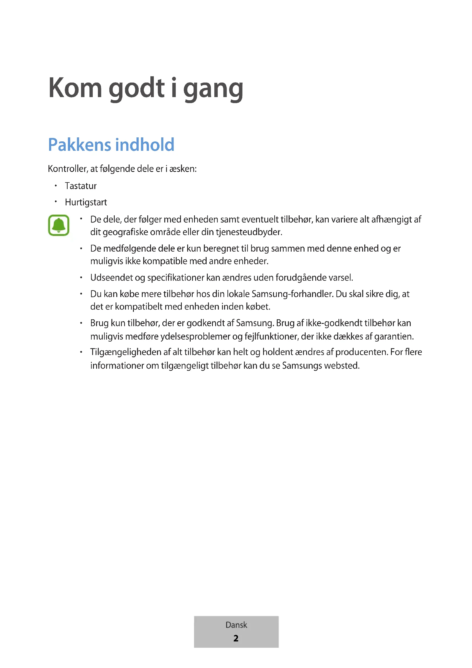 Tilgængeligheden af alt tilbehør kan helt og holdent ændres af producenten. For flere informationer om tilgængeligt tilbehør kan du se Samsungs websted. Dansk 2Kom godt i gang