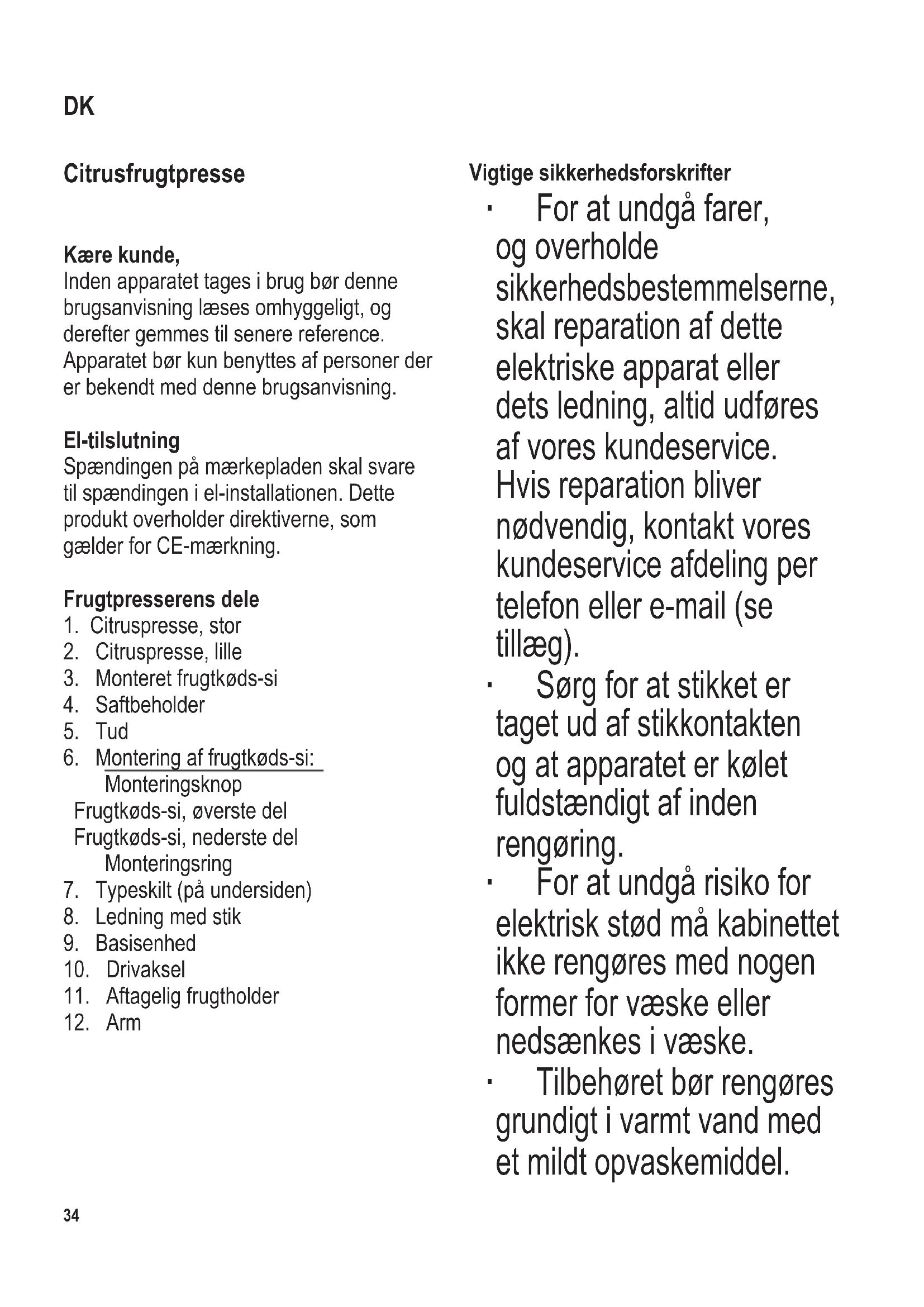 Betjening ∙ Saml apparatet som beskrevet ovenfor. ∙ Placér en egnet beholder under tuden. Tryk tuden nedad. Tip! Det er også muligt at vente med at aftappe saften, indtil presningen er afsluttet. Vip i så fald tuden op. Hold øje med saftmængden i saftbeholderen under presningen, og sørg for ikke at overskride Max- markeringen. ∙ Sæt stikket i en stikkontakt. ∙ Skær citrusfrugten i halve, og tryk den ene halvdel mod citruspressen med skæreadennedad. ∙ Tryk armen ned. ∙ Citruspressen starter, når der presses ned, og den standser igen, når armen slippes. Tip! Med frugtkødsregulatoren kan man selv bestemme, hvor meget frugtkød derskalværeisaften: =siåben→megetfrugtkød =silukket→lidtfrugtkød ∙ Hvis der presses større mængder frugt, kan det være nødvendigt at tømme frugtkøds-sien af og til. ∙ Vip safttuden op, når apparatet ikke længere skal bruges, og sluk for det. ∙ Tag stikket ud, og rengør apparatet. Rengøring og vedligehold ∙ Tag altid stikket ud af stikkontakten inden rengøring af apparatet. ∙ For at undgå risiko for elektrisk stød må apparatet ikke rengøres med nogen former for væske eller nedsænkes i væske. ∙ Brug ikke slibende, skrappe rengøringsmidler eller hårde børster til rengøringen. ∙ Kabinettet kan rengøres med en letfugtig, fnugfri klud. ∙ Frugtholderen frigøres ved at trykke på den sorte cirkel i armen. Sæt frugtholderen tilbage i armen med et fast tryk, når rengøringen er afsluttet. ∙ Frugtkøds-sien kan skilles ad, så den er lettere at rengøre. Frigør monteringsknoppen mod uret for at gøre dette. Saml sien igen efter endt rengøring som beskrevet under ‚Montering af apparat‘. ∙ Rengør de aftagelige tilbehørsdele i varmt vand tilsat almindeligt opvaskemiddel, og tør dem grundigt af. ∙ De aftagelige tilbehørsdele tåler også opvaskemaskine. Bortskaffelse Apparater mærket med dette symbol må ikke smides ud sammen med husholdningsaffaldet, da de indeholder værdifulde materialer som kan genbruges. Korrekt bortskaffelse beskytter både miljøet og menneskers helbred. Din kommune eller forhandleren kan give dig yderligere information om dette.38 104 x 142 mm Garantierklæring På dette husholdningsprodukt overtager vi garantien i to år fra salgsdatoen. Garantien gælder for materiale- og fabrikationsfejl. Skader, der er opstået som følge af forkert behandling, normalt slid samt på skrøbelige dele som f.eks. glas, dækkes ikke af garantien. Denne garanti har ingen indvirkning på dine lovmæssige rettigheder, heller ikke de nationale forbrugerrettigheder om anskaffelse af varer. Hvis produktet ikke fungerer og må returneres, skal det pakkes forsvarligt ind, og navn, adresse samt årsagen til returneringen skal vedlægges. Hvis dette sker mens garantien stadig dækker, må garantibeviset og kvitteringen også lægges ved. Garantien bortfalder ligeledes ved indgreb på produktet af folk, der ikke er autoriseret af os.104 x 142 mm