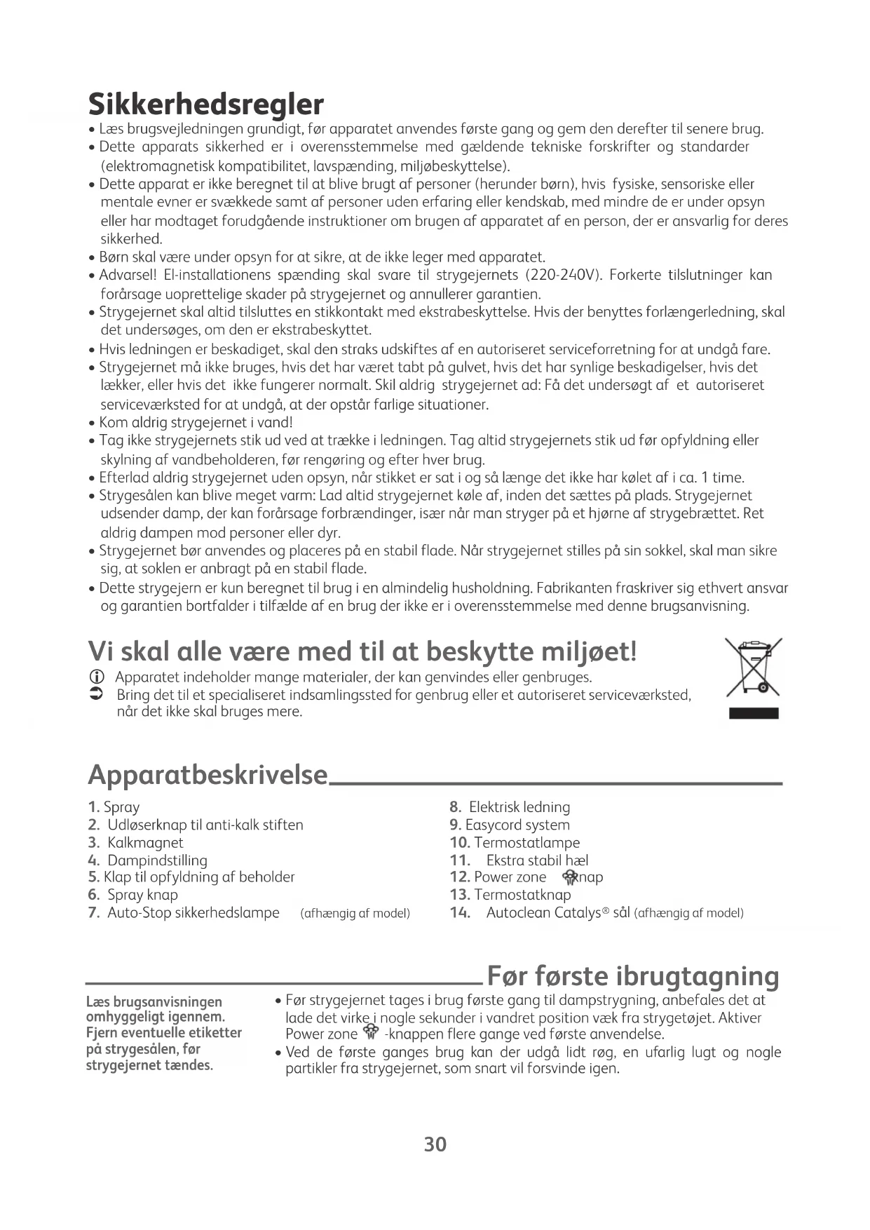 - Dette strygejern er kun beregnet til brug i en almindelig husholdning. Fabrikanten fraskriver sig ethvert ansvar og garantien bortfalder i tilfælde af en brug der ikke er i overensstemmelse med denne brugsanvisning. Vi skal alle være med til at beskytte miljøet! ! Apparatet indeholder mange materialer, der kan genvindes eller genbruges. Bring det til et specialiseret indsamlingssted for genbrug eller et autoriseret serviceværksted, når det ikke skal bruges mere. Apparatbeskrivelse