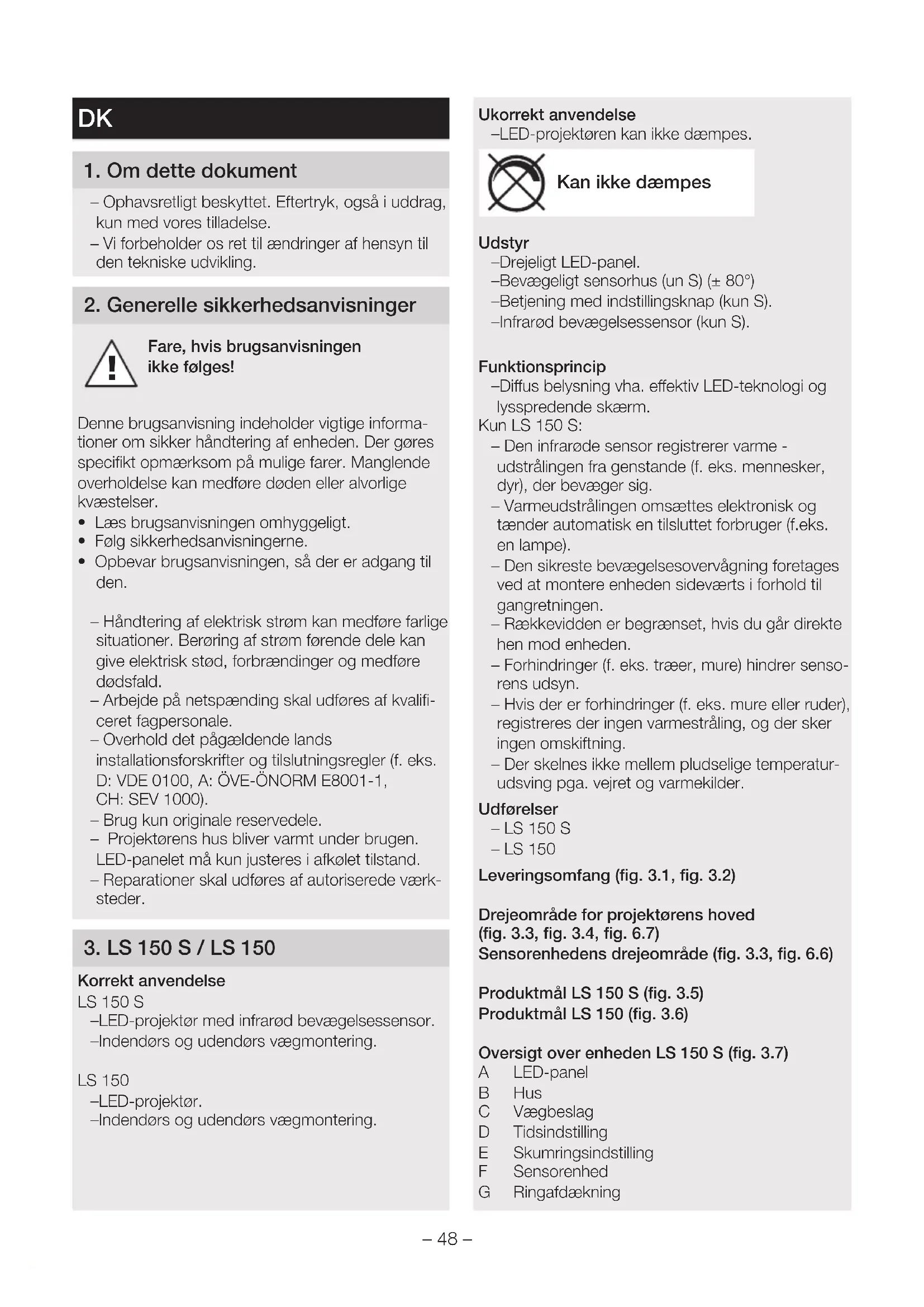 Korrekt anvendelse LS150S – LED-projektør med infrarød bevægelsessensor. – Indendørs og udendørs vægmontering. LS150 – LED-projektør. – Indendørs og udendørs vægmontering. Ukorrekt anvendelse – LED-projektøren kan ikke dæmpes. Kan ikke dæmpes Udstyr – Drejeligt LED-panel. – Bevægeligt sensorhus (un S) (±80°) – Betjening med indstillingsknap (kun S). – Infrarød bevægelsessensor (kun S). Funktionsprincip – Dius belysning vha. eektiv LED-teknologi og lysspredende skærm. Kun LS 150 S: – Den infrarøde sensor registrerer varme - udstrålingen fra genstande (f.eks. mennesker, dyr), der bevæger sig. – Varmeudstrålingen omsættes elektronisk og tænder automatisk en tilsluttet forbruger (f.eks. en lampe). – Den sikreste bevægelsesovervågning foretages ved at montere enheden sideværts i forhold til gangretningen. – Rækkevidden er begrænset, hvis du går direkte hen mod enheden. – Forhindringer (f.eks. træer, mure) hindrer senso- rens udsyn. – Hvis der er forhindringer (f.eks. mure eller ruder), registreres der ingen varmestråling, og der sker ingen omskiftning. – Der skelnes ikke mellem pludselige temperatur- udsving pga. vejret og varmekilder. Udførelser – LS150S – LS150 Leveringsomfang (fig. 3.1, fig.3.2) Drejeområde for projektørens hoved (fig. 3.3, fig.3.4, fig.6.7) Sensorenhedens drejeområde (fig. 3.3, fig.6.6) Produktmål LS150S (fig.3.5) Produktmål LS150 (fig. 3.6) Oversigt over enheden LS150S (fig.3.7) A LED-panel B Hus C Vægbeslag D Tidsindstilling E Skumringsindstilling F Sensorenhed G Ringafdækning– 49 – Oversigt over enheden LS150S (fig.3.8) A LED-panel B Hus C Vægbeslag Tekniske data – Mål (H×B×D): LS 150 S: 210×155×176mm LS 150: 178×157×178mm – Eektforbrug (P