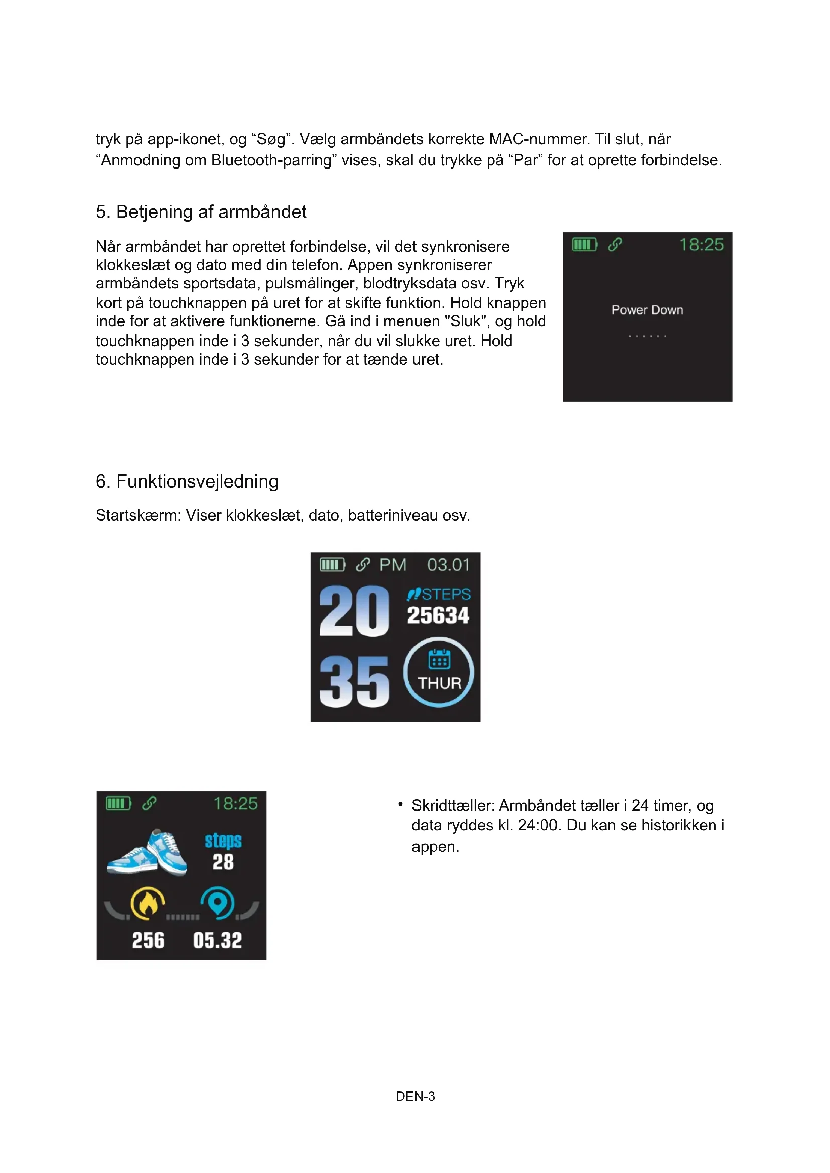 DEN-3 Når armbåndet har oprettet forbindelse, vil det synkronisere klokkeslæt og dato med din telefon. Appen synkroniserer armbåndets sportsdata, pulsmålinger, blodtryksdata osv. Tryk kort på touchknappen på uret for at skifte funktion. Hold knappen inde for at aktivere funktionerne. Gå ind i menuen "Sluk", og hold touchknappen inde i 3 sekunder, når du vil slukke uret. Hold touchknappen inde i 3 sekunder for at tænde uret.Motion: Registrerer din daglige motionstid, og data ryddes kl. 24:00. Du kan se historikken i appen. Pulsmonitor: Måler automatisk pulsen, når funktionen er slået til. Data om puls gemmes i appen. Test af SpO