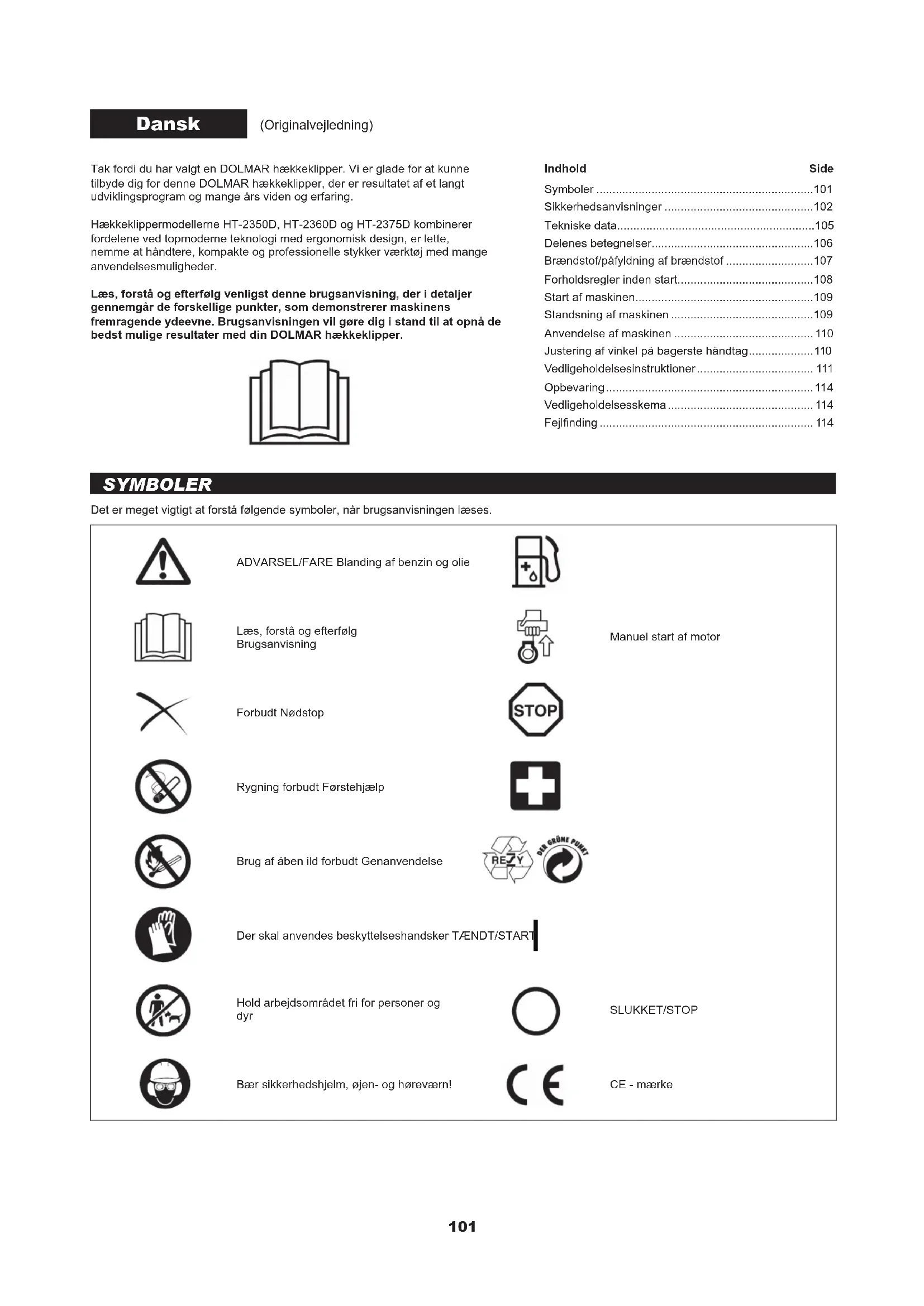 - Avaria Sistema Observação Causa O motor não arranca ou arranca com diculdade Sistema de ignição Ignição por vela presente Avaria no fornecimento de combustível ou sistema de compressão, defeito mecânico Sem ignição por vela Funcionamento através do botão I-O, avaria na cablagem ou curto-circuito, vela de ignição ou conector defeituoso, módulo de ignição avariado Fornecimento de combustível Depósito de combustível enchido Posição incorrecta do afogador, carburador defeituoso, cabeça de sucção (ltro da linha de gás) suja, linha de fornecimento de combustível dobrada ou interrompida Compressão No interior do motor Junta inferior do cilindro defeituosa, vedantes da cambota danicados, cilindro ou segmentos do êmbolo defeituosos No exterior do motor Vedação inadequada da vela de ignição Avaria mecânica Dispositivo de arranque não engrenado Mola do dispositivo de arranque partida, peças partidas dentro do motor Problemas no arranque a quente Depósito cheio vela de ignição existente Carburador contaminado, limpe-o O motor arranca mas morre imediatamente Fornecimento de combustível Depósito cheio Ajuste de marcha lenta incorrecto, cabeça de sucção ou carburador contaminado Ventilação do depósito de combustível defeituosa, linha de fornecimento de combustível interrompida, cabo ou botão I-O avariado Desempenho insuciente Vários sistemas podem estar afectados em simultâneo Motor em marcha lenta Filtro de ar contaminado, carburador contaminado, silenciador entupido, conduta de escape no cilindro entupida101 Tak fordi du har valgt en DOLMAR hækkeklipper. Vi er glade for at kunne tilbyde dig for denne DOLMAR hækkeklipper, der er resultatet af et langt udviklingsprogram og mange års viden og erfaring. Hækkeklippermodellerne HT-2350D, HT-2360D og HT-2375D kombinerer fordelene ved topmoderne teknologi med ergonomisk design, er lette, nemme at håndtere, kompakte og professionelle stykker værktøj med mange anvendelsesmuligheder. Læs, forstå og efterfølg venligst denne brugsanvisning, der i detaljer gennemgår de forskellige punkter, som demonstrerer maskinens fremragende ydeevne. Brugsanvisningen vil gøre dig i stand til at opnå de bedst mulige resultater med din DOLMAR hækkeklipper. Det er meget vigtigt at forstå følgende symboler, når brugsanvisningen læses. SYMBOLER Dansk ADVARSEL/FARE Blanding af benzin og olie Læs, forstå og efterfølg Brugsanvisning Manuel start af motor Forbudt Nødstop Rygning forbudt Førstehjælp Brug af åben ild forbudt Genanvendelse Der skal anvendes beskyttelseshandsker TÆNDT/START Hold arbejdsområdet fri for personer og dyr SLUKKET/STOP Bær sikkerhedshjelm, øjen- og høreværn! CE - mærke (Originalvejledning) Indhold Side Symboler p. 101