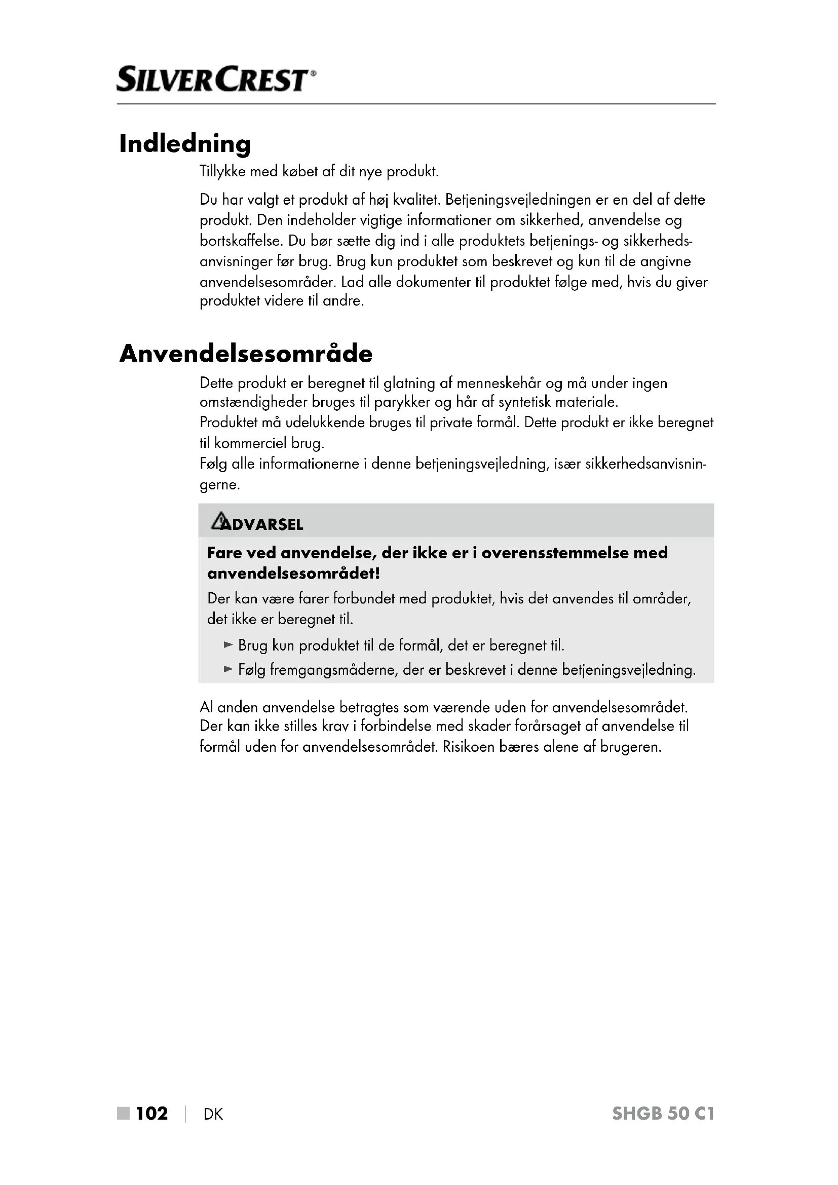 DK SHGB 50 C1 Indledning Tillykke med købet af dit nye produkt. Du har valgt et produkt af høj kvalitet. Betjeningsvejledningen er en del af dette produkt. Den indeholder vigtige informationer om sikkerhed, anvendelse og bortskaffelse. Du bør sætte dig ind i alle produktets betjenings- og sikkerheds- anvisninger før brug. Brug kun produktet som beskrevet og kun til de angivne anvendelsesområder. Lad alle dokumenter til produktet følge med, hvis du giver produktet videre til andre. Anvendelsesområde Dette produkt er beregnet til glatning af menneskehår og må under ingen omstændigheder bruges til parykker og hår af syntetisk materiale. Produktet må udelukkende bruges til private formål. Dette produkt er ikke beregnet til kommerciel brug. Følg alle informationerne i denne betjeningsvejledning, især sikkerhedsanvisnin- gerne. ADVARSEL Fare ved anvendelse, der ikke er i overensstemmelse med anvendelsesområdet! Der kan være farer forbundet med produktet, hvis det anvendes til områder, det ikke er beregnet til. ► Brug kun produktet til de formål, det er beregnet til. ► Følg fremgangsmåderne, der er beskrevet i denne betjeningsvejledning. Al anden anvendelse betragtes som værende uden for anvendelsesområdet. Der kan ikke stilles krav i forbindelse med skader forårsaget af anvendelse til formål uden for anvendelsesområdet. Risikoen bæres alene af brugeren.DK