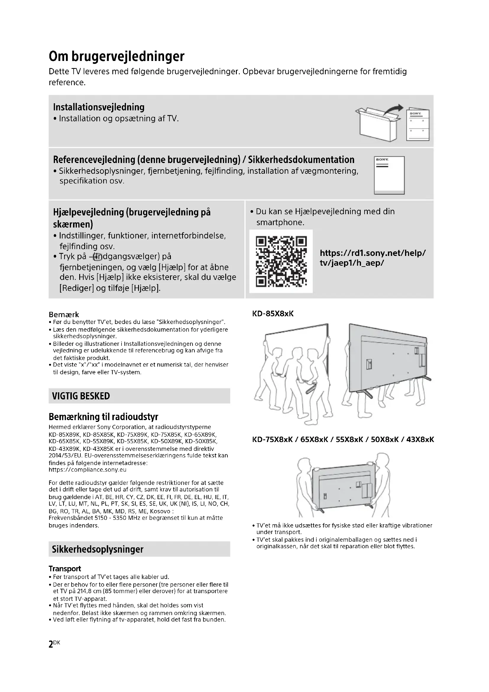 - Det viste "x"/"xx" i modelnavnet er et numerisk tal, der henviser til design, farve eller TV-system. Bemærkning til radioudstyr Hermed erklærer Sony Corporation, at radioudstyrstyperne KD-85X89K, KD-85X85K, KD-75X89K, KD-75X85K, KD-65X89K, KD-65X85K, KD-55X89K, KD-55X85K, KD-50X89K, KD-50X85K, KD-43X89K, KD-43X85K er i overensstemmelse med direktiv 2014/53/EU. EU-overensstemmelseserklæringens fulde tekst kan findes på følgende internetadresse: https://compliance.sony.eu For dette radioudstyr gælder følgende restriktioner for at sætte det i drift eller tage det ud af drift, samt krav til autorisation til brug gældende i AT, BE, HR, CY, CZ, DK, EE, FI, FR, DE, EL, HU, IE, IT, LV, LT, LU, MT, NL, PL, PT, SK, SI, ES, SE, UK, UK (NI), IS, LI, NO, CH, BG, RO, TR, AL, BA, MK, MD, RS, ME, Kosovo : Frekvensbåndet 5150 - 5350 MHz er begrænset til kun at måtte bruges indendørs. Transport