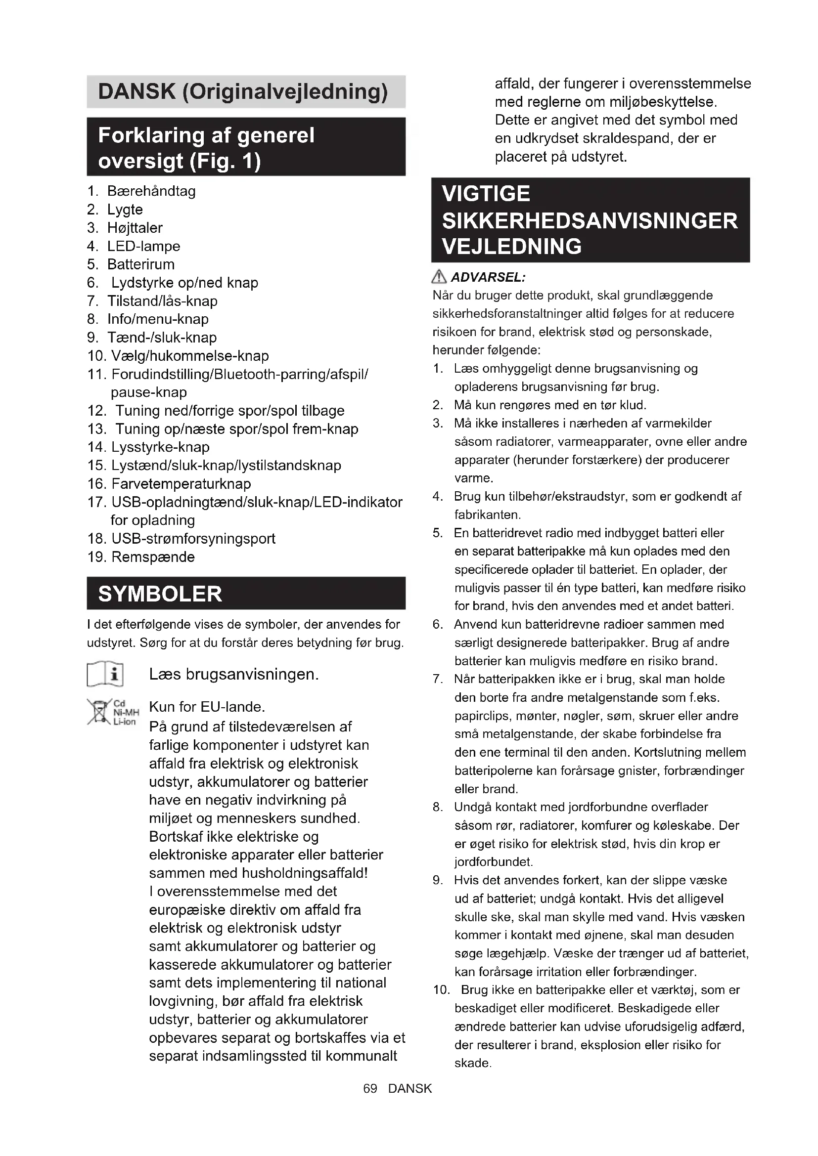 SYMBOLER I det efterfølgende vises de symboler, der anvendes for udstyret. Sørg for at du forstår deres betydning før brug. Læs brugsanvisningen. Kun for EU-lande. På grund af tilstedeværelsen af farlige komponenter i udstyret kan affald fra elektrisk og elektronisk udstyr, akkumulatorer og batterier have en negativ indvirkning på miljøet og menneskers sundhed. Bortskaf ikke elektriske og elektroniske apparater eller batterier sammen med husholdningsaffald! I overensstemmelse med det europæiske direktiv om affald fra elektrisk og elektronisk udstyr samt akkumulatorer og batterier og kasserede akkumulatorer og batterier samt dets implementering til national lovgivning, bør affald fra elektrisk udstyr, batterier og akkumulatorer opbevares separat og bortskaffes via et separat indsamlingssted til kommunalt affald, der fungerer i overensstemmelse med reglerne om miljøbeskyttelse. Dette er angivet med det symbol med en udkrydset skraldespand, der er placeret på udstyret. VIGTIGE SIKKERHEDSANVISNINGER VEJLEDNING ADVARSEL: Når du bruger dette produkt, skal grundlæggende sikkerhedsforanstaltninger altid følges for at reducere risikoen for brand, elektrisk stød og personskade, herunder følgende: