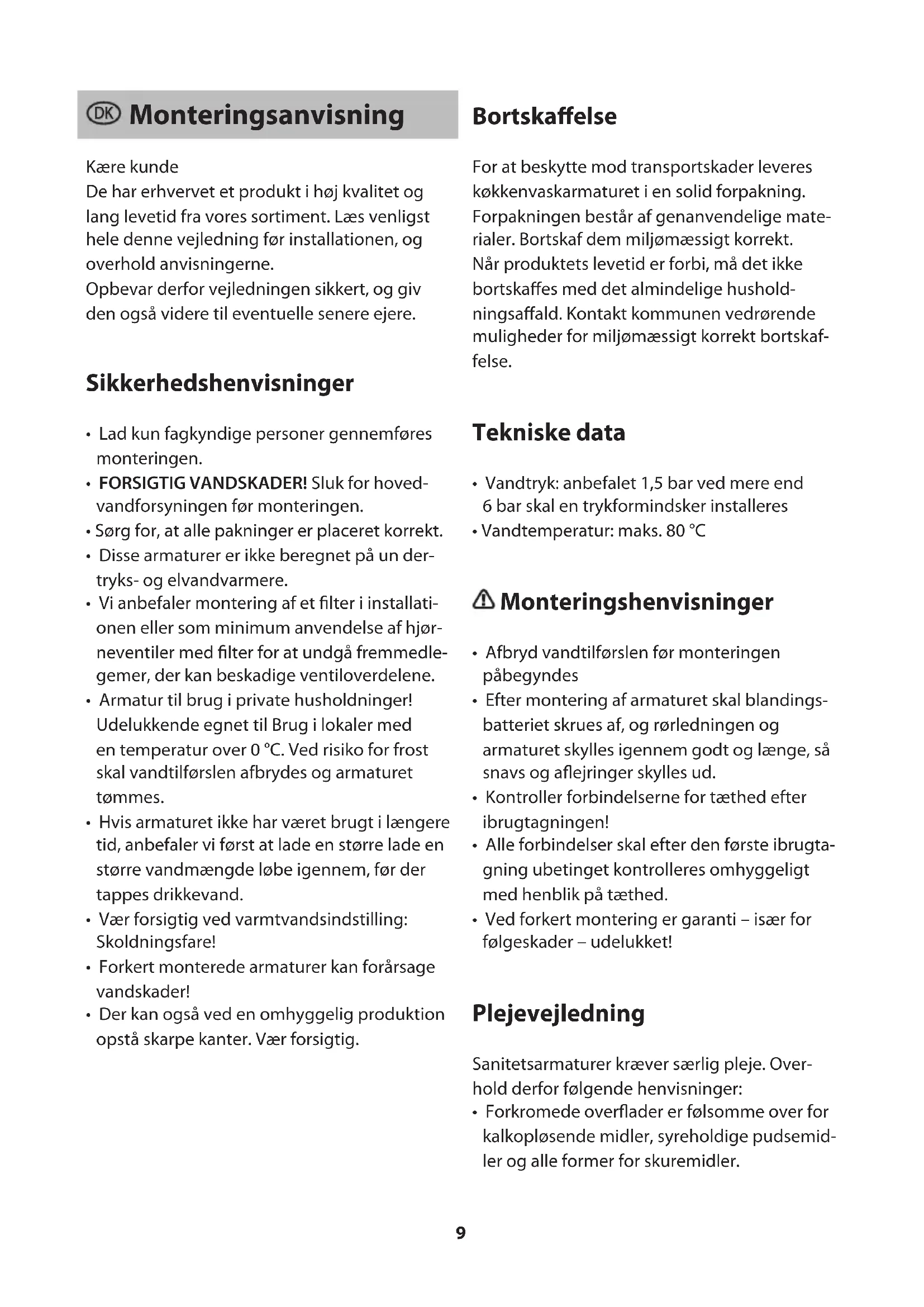 For at beskytte mod transportskader leveres køkkenvaskarmaturet i en solid forpakning. Forpakningen består af genanvendelige materialer. Bortskaf dem miljømæssigt korrekt. Når produktets levetid er forbi, må det ikke bortskaffes med det almindelige husholdningsaffald. Kontakt kommunen vedrørende muligheder for miljømæssigt korrekt bortskaffelse.