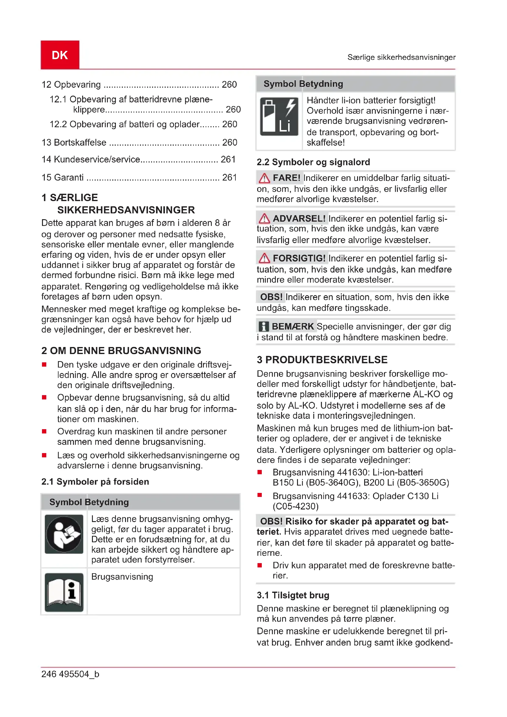 FARE! Indikerer en umiddelbar farlig situati- on, som, hvis den ikke undgås, er livsfarlig eller medfører alvorlige kvæstelser. ADVARSEL! Indikerer en potentiel farlig si- tuation, som, hvis den ikke undgås, kan være livsfarlig eller medføre alvorlige kvæstelser. FORSIGTIG! Indikerer en potentiel farlig si- tuation, som, hvis den ikke undgås, kan medføre mindre eller moderate kvæstelser. OBS! Indikerer en situation, som, hvis den ikke undgås, kan medføre tingsskade. BEMÆRK Specielle anvisninger, der gør dig i stand til at forstå og håndtere maskinen bedre. 3 PRODUKTBESKRIVELSE Denne brugsanvisning beskriver forskellige mo- deller med forskelligt udstyr for håndbetjente, bat- teridrevne plæneklippere af mærkerne AL‑KO og solobyAL‑KO. Udstyret i modellerne ses af de tekniske data i monteringsvejledningen. Maskinen må kun bruges med de lithium-ion bat- terier og opladere, der er angivet i de tekniske data. Yderligere oplysninger om batterier og opla- dere findes i de separate vejledninger: