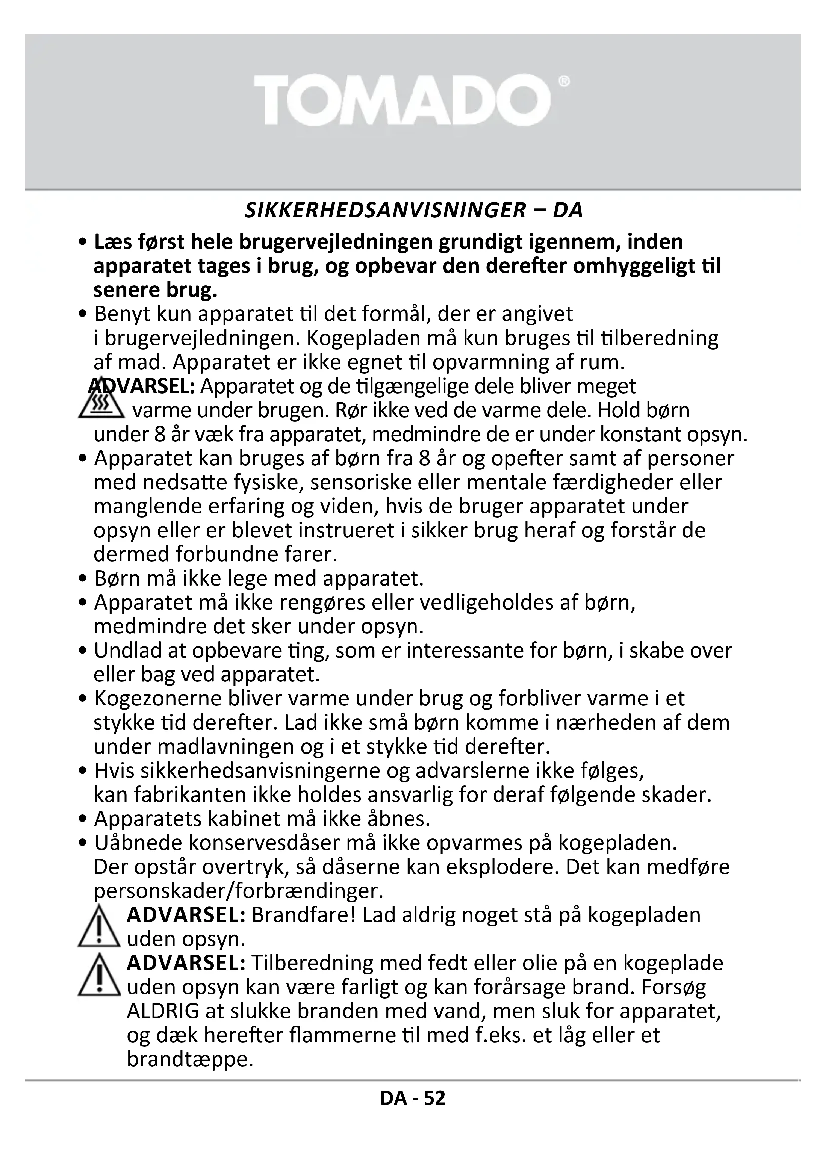 ADVARSEL: Tilberedning med fedt eller olie på en kogeplade,uden opsyn kan vare farligt og kan forarsage brand. Forsog ALDRIG at slukke branden med vand, men sluk for apparatet, og dæk herefter flammerne til med f.eks. et lag erler et brandtæppe.