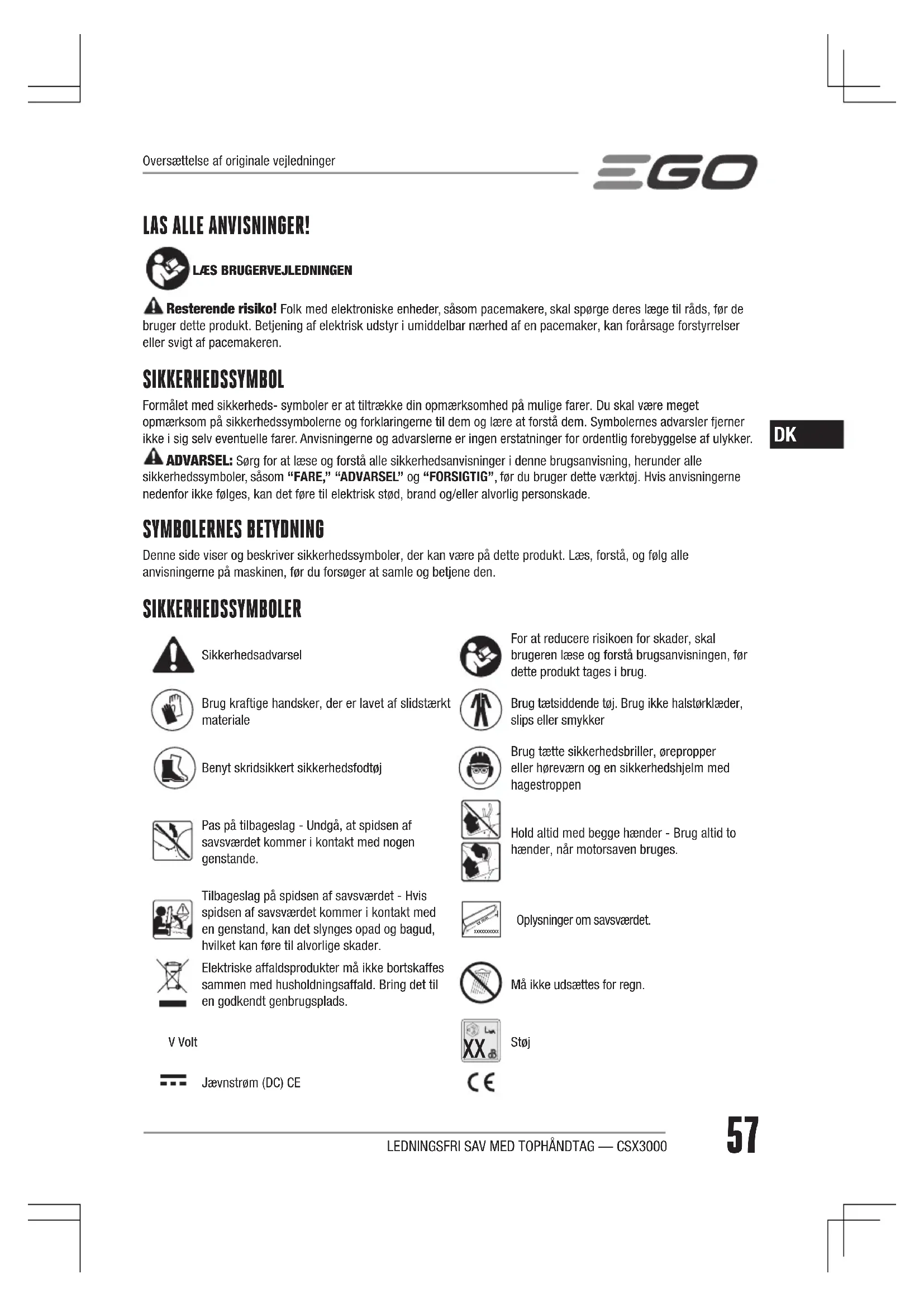 Download vejledningen til din Sav i PDF-format gratis! Find din vejledning CSX3000 - EGO og tag din elektroniske enhed tilbage i hånden. På denne side er alle dokumenter nødvendige for brugen af din enhed offentliggjort. CSX3000 af mærket EGO.