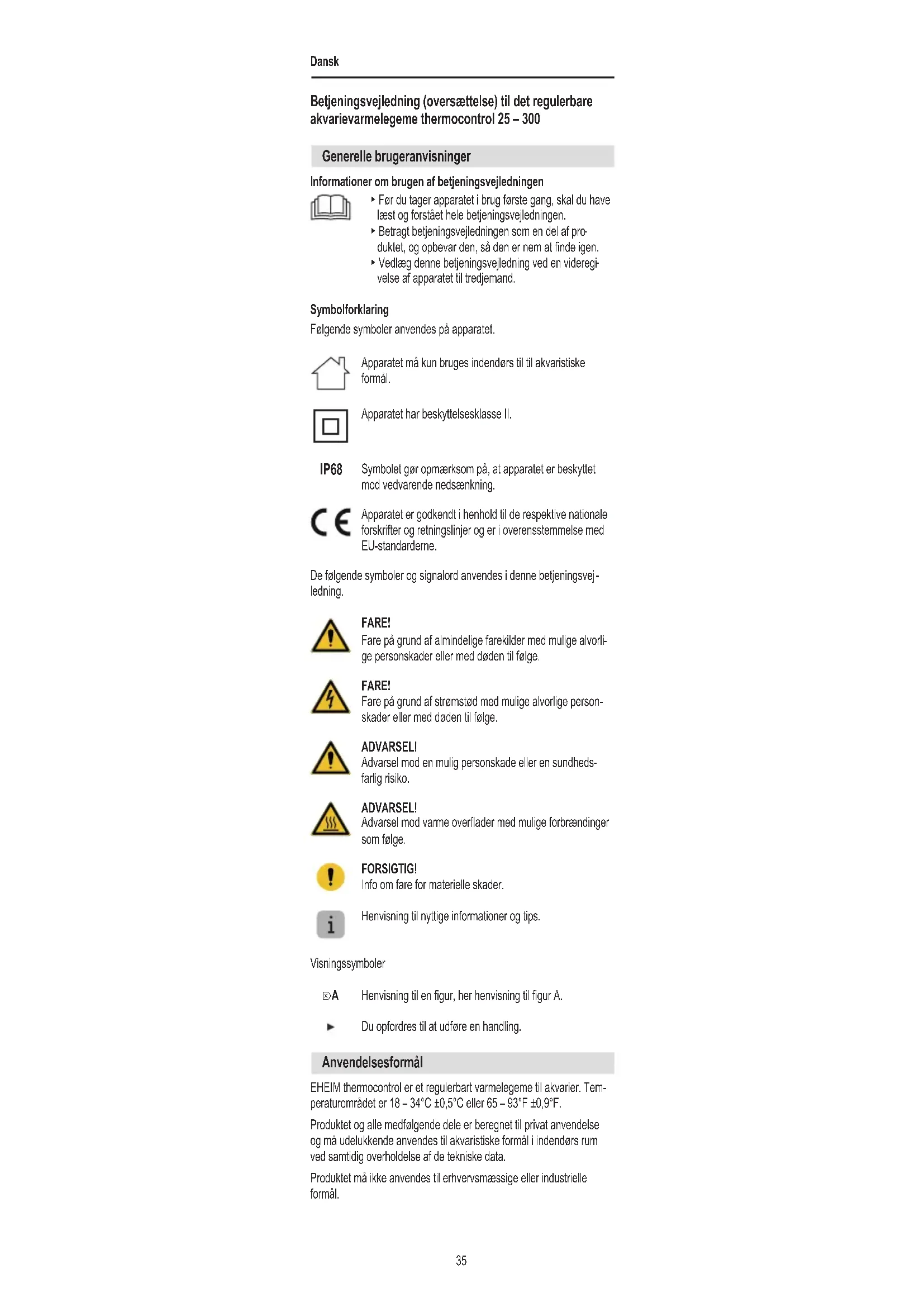 Anvendelsesformål EHEIM thermocontrol er et regulerbart varmelegeme til akvarier. Tem- peraturområdet er 18 – 34°C ±0,5°C eller 65 – 93°F ±0,9°F. Produktet og alle medfølgende dele er beregnet til privat anvendelse og må udelukkende anvendes til akvaristiske formål i indendørs rum ved samtidig overholdelse af de tekniske data. Produktet må ikke anvendes til erhvervsmæssige eller industrielle formål.Dansk
