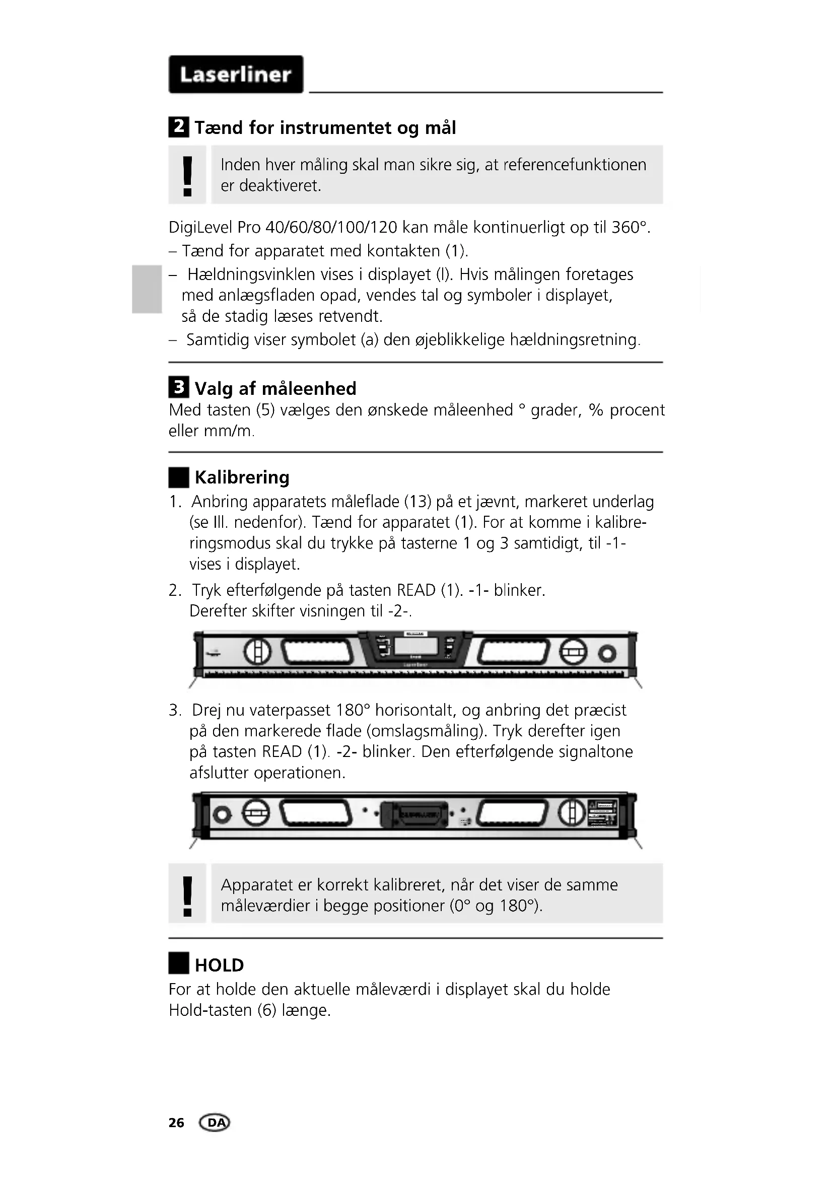 Kalibrering4 Valg af måleenhed Apparatet er korrekt kalibreret, når det viser de samme måleværdier i begge positioner (0° og 180°).
