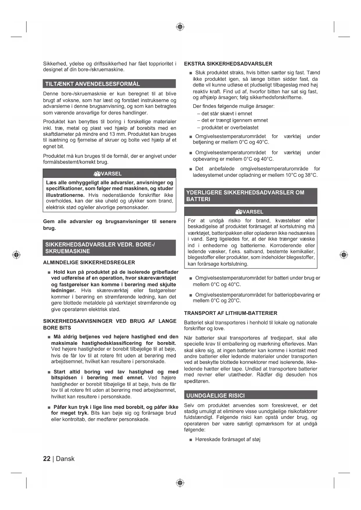 BORE BITS ■ Må aldrig betjenes ved højere hastighed end den maksimale hastighedsklassificering for borebit. Ved højere hastigheder er borebit tilbøjelige til at bøje, hvis de får lov til at rotere frit uden at berøring med arbejdsemnet, hvilket kan resultere i personskade. ■ Start altid boring ved lav hastighed og med bitspidsen i berøring med emnet. Ved højere hastigheder er borebit tilbøjelige til at bøje, hvis de får lov til at rotere frit uden at berøring med arbejdsemnet, hvilket kan resultere i personskade. ■ Påfør kun tryk i lige line med borebit, og påfør ikke for meget tryk. Bits kan bøje sig og forårsage brud eller kontroltab, der medfører personskade. EKSTRA SIKKERHEDSADVARSLER ■ Sluk produktet straks, hvis bitten sætter sig fast. Tænd ikke produktet igen, så længe bitten sidder fast, da dette vil kunne udløse et pludseligt tilbageslag med høj reaktiv kraft. Find ud af, hvorfor bitten har sat sig fast, og afhjælp årsagen; følg sikkerhedsforskrifterne. Der findes følgende mulige årsager: – det står skævt i emnet – det er trængt igennem emnet – produktet er overbelastet ■ Omgivelsestemperaturområdet for værktøj under betjening er mellem 0°C og 40°C. ■ Omgivelsestemperaturområdet for værktøj under opbevaring er mellem 0°C og 40°C. ■ Det anbefalede omgivelsestemperaturområde for ladesystemet under opladning er mellem 10°C og 38°C.