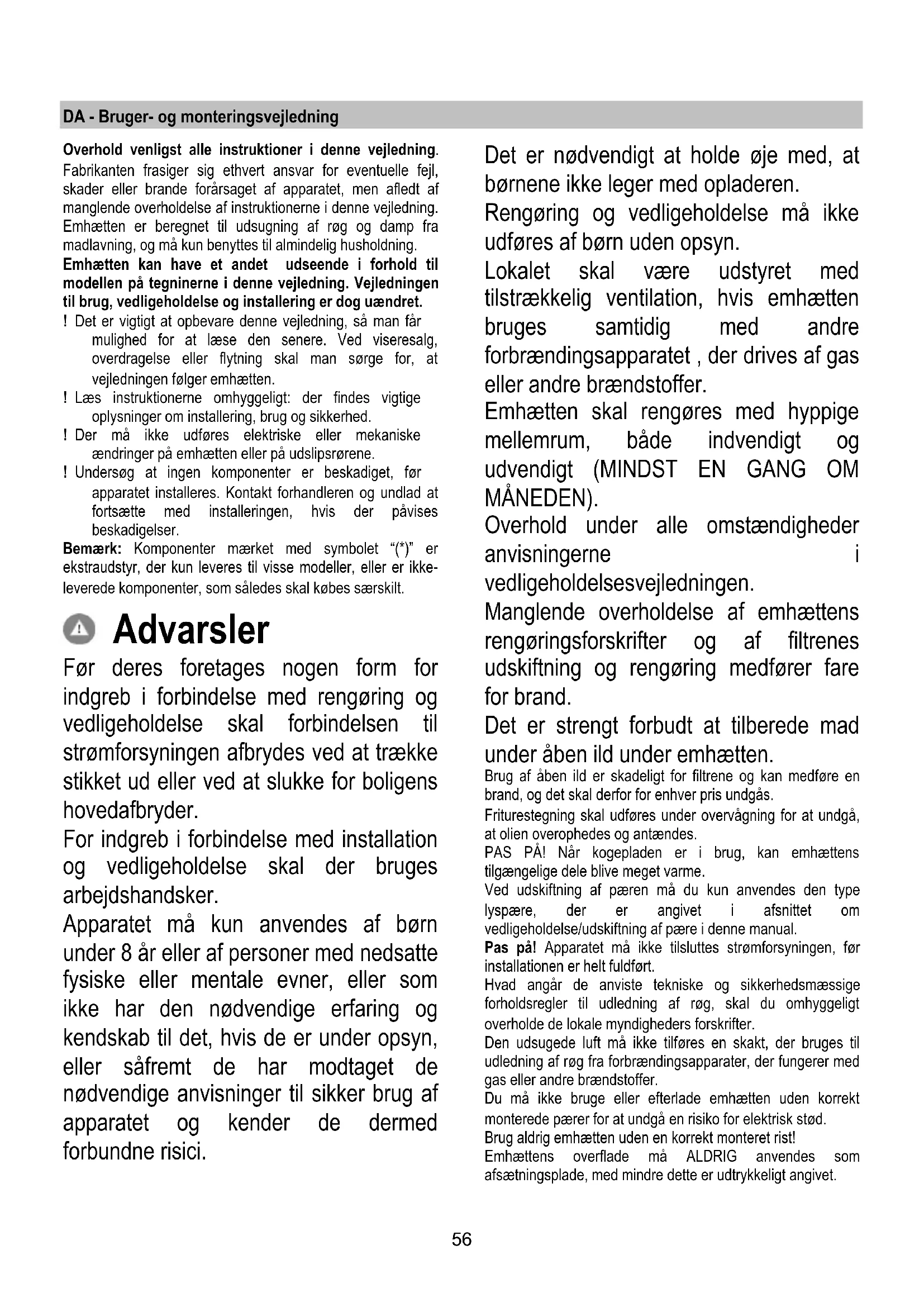 Dersom belysningen ikke skulle virke, kontroller at lyspærene er satt korrekt på plass før du henvender deg til teknisk assistanse. - Modell med LED pærer Ventilatoren er utstyrt med et belysningssystem basert på LED-teknologi. LED-lysene garanterer optimal belysning, har opptil 10 ganger lengre varighet enn tradisjonelle lyspærer og tillater en strømsparing på 90 %. Henvend deg til teknisk service når LED-pærene skal skiftes ut.56 DA - Bruger- og monteringsvejledning Overhold venligst alle instruktioner i denne vejledning. Fabrikanten frasiger sig ethvert ansvar for eventuelle fejl, skader eller brande forårsaget af apparatet, men afledt af manglende overholdelse af instruktionerne i denne vejledning. Emhætten er beregnet til udsugning af røg og damp fra madlavning, og må kun benyttes til almindelig husholdning. Emhætten kan have et andet udseende i forhold til modellen på tegninerne i denne vejledning. Vejledningen til brug, vedligeholdelse og installering er dog uændret. ! Det er vigtigt at opbevare denne vejledning, så man får mulighed for at læse den senere. Ved viseresalg, overdragelse eller flytning skal man sørge for, at vejledningen følger emhætten. ! Læs instruktionerne omhyggeligt: der findes vigtige oplysninger om installering, brug og sikkerhed. ! Der må ikke udføres elektriske eller mekaniske ændringer på emhætten eller på udslipsrørene. ! Undersøg at ingen komponenter er beskadiget, før apparatet installeres. Kontakt forhandleren og undlad at fortsætte med installeringen, hvis der påvises beskadigelser. Bemærk: Komponenter mærket med symbolet “(*)” er ekstraudstyr, der kun leveres til visse modeller, eller er ikke- leverede komponenter, som således skal købes særskilt. Advarsler Før deres foretages nogen form for indgreb i forbindelse med rengøring og vedligeholdelse skal forbindelsen til strømforsyningen afbrydes ved at trække stikket ud eller ved at slukke for boligens hovedafbryder. For indgreb i forbindelse med installation og vedligeholdelse skal der bruges arbejdshandsker. Apparatet må kun anvendes af børn under 8 år eller af personer med nedsatte fysiske eller mentale evner, eller som ikke har den nødvendige erfaring og kendskab til det, hvis de er under opsyn, eller såfremt de har modtaget de nødvendige anvisninger til sikker brug af apparatet og kender de dermed forbundne risici. Det er nødvendigt at holde øje med, at børnene ikke leger med opladeren. Rengøring og vedligeholdelse må ikke udføres af børn uden opsyn. Lokalet skal være udstyret med tilstrækkelig ventilation, hvis emhætten bruges samtidig med andre forbrændingsapparatet , der drives af gas eller andre brændstoffer. Emhætten skal rengøres med hyppige mellemrum, både indvendigt og udvendigt (MINDST EN GANG OM MÅNEDEN). Overhold under alle omstændigheder anvisningerne i vedligeholdelsesvejledningen. Manglende overholdelse af emhættens rengøringsforskrifter og af filtrenes udskiftning og rengøring medfører fare for brand. Det er strengt forbudt at tilberede mad under åben ild under emhætten. Brug af åben ild er skadeligt for filtrene og kan medføre en brand, og det skal derfor for enhver pris undgås. Friturestegning skal udføres under overvågning for at undgå, at olien overophedes og antændes. PAS PÅ! Når kogepladen er i brug, kan emhættens tilgængelige dele blive meget varme. Ved udskiftning af pæren må du kun anvendes den type lyspære, der er angivet i afsnittet om vedligeholdelse/udskiftning af pære i denne manual. Pas på! Apparatet må ikke tilsluttes strømforsyningen, før installationen er helt fuldført. Hvad angår de anviste tekniske og sikkerhedsmæssige forholdsregler til udledning af røg, skal du omhyggeligt overholde de lokale myndigheders forskrifter. Den udsugede luft må ikke tilføres en skakt, der bruges til udledning af røg fra forbrændingsapparater, der fungerer med gas eller andre brændstoffer. Du må ikke bruge eller efterlade emhætten uden korrekt monterede pærer for at undgå en risiko for elektrisk stød. Brug aldrig emhætten uden en korrekt monteret rist! Emhættens overflade må ALDRIG anvendes som afsætningsplade, med mindre dette er udtrykkeligt angivet.57 Brug kun de medfølgende fastspændingsskruer til produktet i forbindelse med installationen eller – såfremt de ikke medfølger – skal du indkøbe den korrekte type skruer. Brug skruer af korrekt længde, som anført i installationsvejledningen. I tvivlstilfælde bør du kontakte dit autoriserede servicecenter eller en kvalificeret tekniker. PAS PÅ! Hvis der ikke monteres de skruer og fastspændingsanordninger som angivet i disse anvisninger, kan der opstå risiko for elektriske problemer. Dette apparat er mærket i overensstemmelse med det Europæiske Direktiv 2012/19/EC, Waste Electrical and Electronic Equipment (WEEE). Elektrisk og elektronisk udstyr indeholder materiale, komponenter og stoffer, der kan være skadelige for menneskers sundhed og for miljøet, hvis kasseret elektrisk og elektronisk udstyr ikke håndteres korrekt. Elektrisk og elektronisk udstyr er mærket med nedenstående overkrydsede skraldespand . Den symboliserer, at elektrisk og elektronisk udstyr ikke må bortskaffes sammen med usorteret husholdningsaffald, men indsamles særskilt. Alle kommuner har etableret indsamlingsordninger, hvor elektrisk og elektronisk udstyr gratis kan afleveres af borgerne på genbrugsstationer og andre indsamlingssteder eller bliver afhentet direkte fra husholdningerne. Nærmere information kan fås hos kommunens tekniske forvaltning. Produktet er designet, testet og produceret i henhold til: